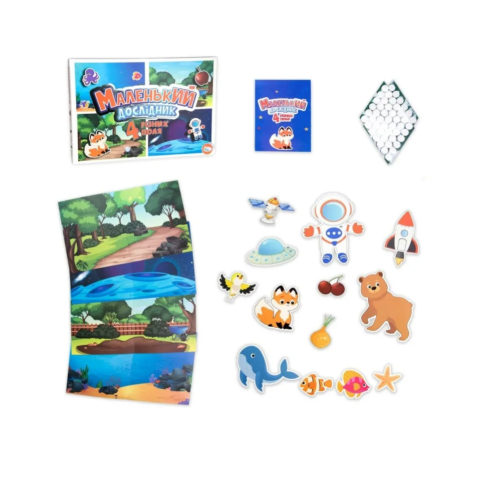 Набір "Маленький дослідник" (Strateg 30294) допоможе вашому малюку урізноманітнити дозвілля та вивчити щось нове просто граючи. Дитині потрібно розрізняти до якого поля підходить кожна фігурка та приклеювати її на своє місце.