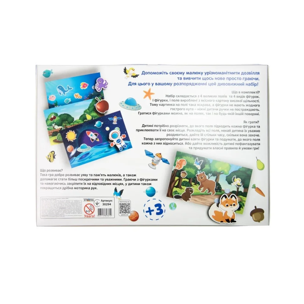 Як грати? Розкладіть всі поля, нехай дитина їх уважно роздивиться, дайте їй стільки часу, скільки вона захоче. Тепер запропонуйте дитині взяти фігурки та подумати, до якого поля кожна з них відноситься. Або дайте можливість дитині пофантазувати та придумати власні правила та умови гри!
