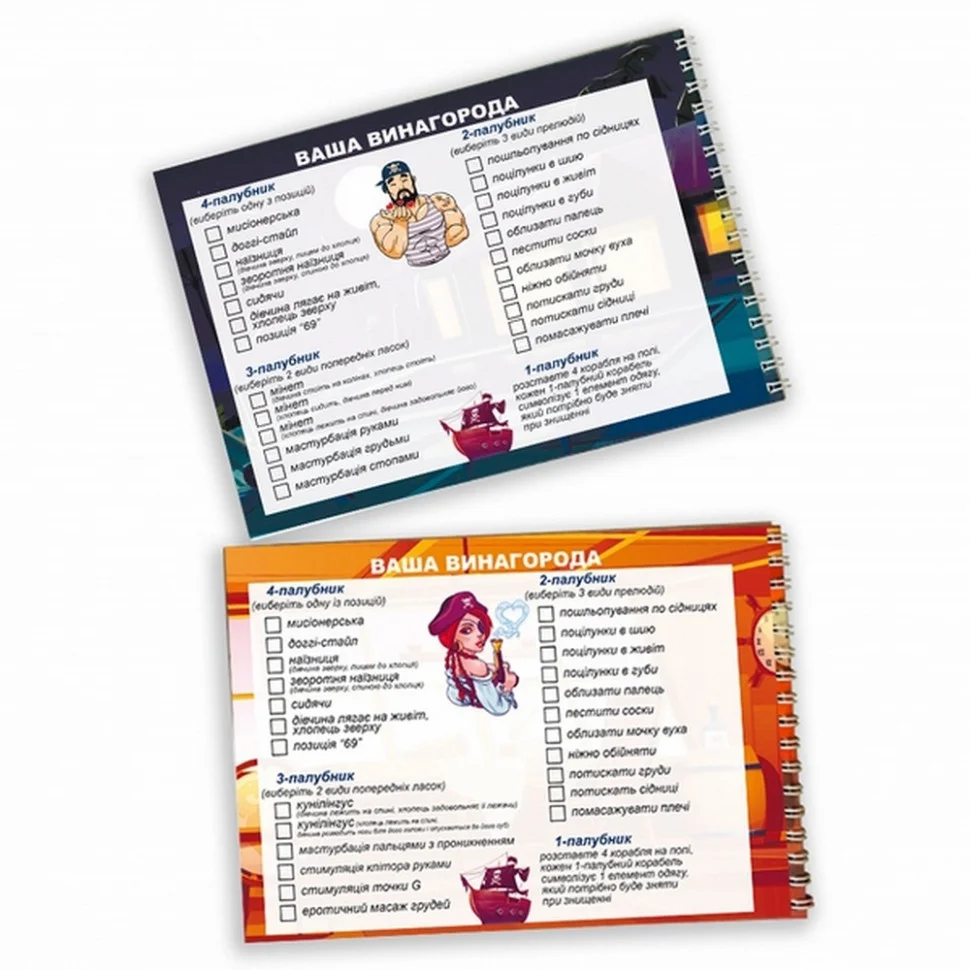 Перед початком битви за задоволення, виберіть, які "бонуси" ви отримаєте за потоплення ворожих кораблів. Список знаходиться на зворотному боці кожного аркуша з полем бою. Важливо! Вам необхідно вибрати ті бажання, які виконає ваш "суперник" у разі своєї поразки (коли його кораблі будуть знищені). Кожен гравець сам обирає, які призи він отримуватиме.