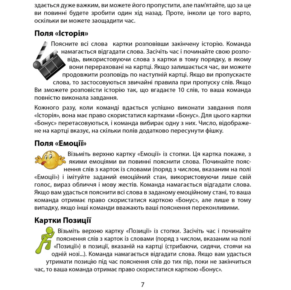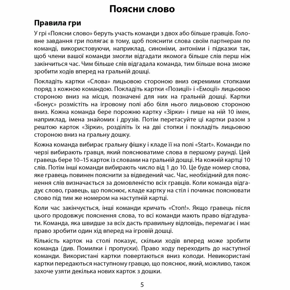 Пояснюйте слова, не використовуючи однокореневі. В комплекті гри понад півтори сотні карток, на кожній з яких по 10 слів. Можливі варіанти гри з ігровим полем і без нього.