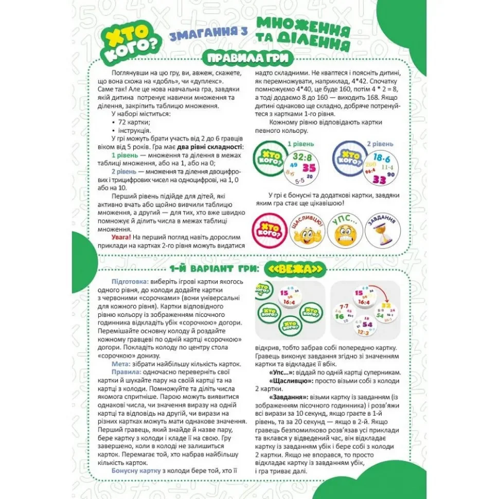 Тепер діти, окрім того, що розвиватимуть увагу, тренуватимуть зорову пам’ять та вміння зосереджуватися, ще й зможуть вдосконалити навички читання, додавання та віднімання, множення, ділення, розширюватимуть географічні знання. Ця гра буде цікавою не лише дітям від 5 років, які щойно вивчили літери чи склад числа 10, а й старшим, бо має два рівні складності.