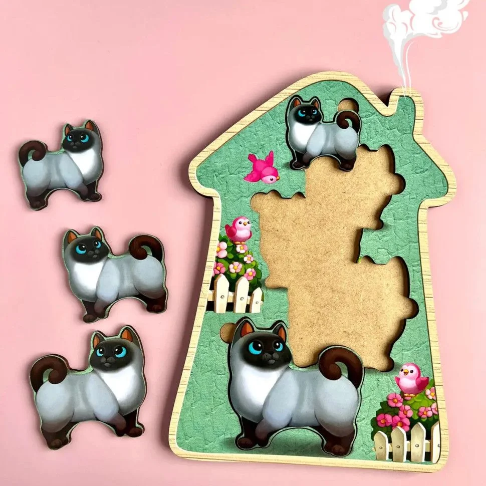 У наборі 5 котиків різного розміру. З цим додатком можна наочно пояснити дитині, що таке розмір і поняття "великий, середній і маленький". Вивчаємо рахунок від 1 до 5: запропонуйте дитині порахувати разом скільки всього персонажів. Викладіть кілька котиків і попросіть порахувати їх. Запитайте у дитини: які котики йдуть вправо, а які вліво?