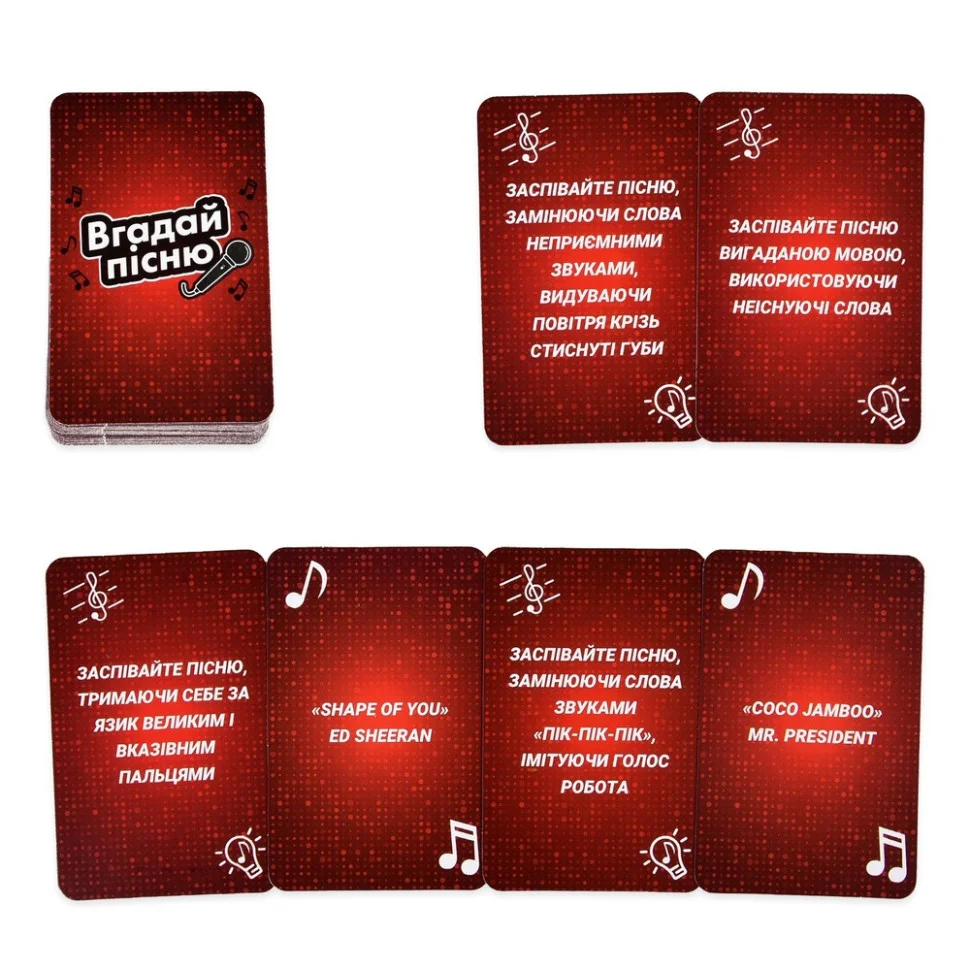 Гра розпалює сміх, креатив і музичний азарт. Вона ідеально підходить для гучних компаній, вечірок, сімейного дозвілля, тімбілдінгу та всіх меломанів.