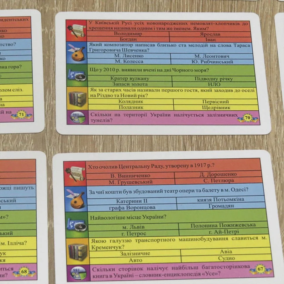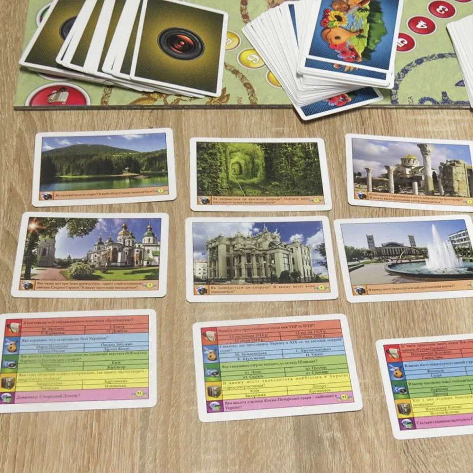 Дитяча настільна гра "Вікторина Україна" 0994, що поєднує в собі відмінну якість виготовлення, продумане наповнення і привабливий дизайн, ідеально підійде в якості подарунка для дитини від 5 до 18 років. Набір представлений в новій колекції торгової марки Artos, яка націлена допомогти малюкові, в захоплюючій формі збільшити пізнання про батьківщину і розширити кругозір. Для гри передбачено двостороннє ігрове поле зі звичайним і підвищеним рівнем складності, а також 96 карток з питаннями в п'яти різних категоріях і 48 карток з фото питаннями. Щоб грати, необхідно кидати кубик, відповідати на питання, поступово просуваючись на рівень вище. Гра тренує логічне сприйняття, стратегічне і абстрактне мислення, розвиває навички запам'ятовування, фантазію, дрібну моторику пальчиків, посидючість і цілеспрямованість.