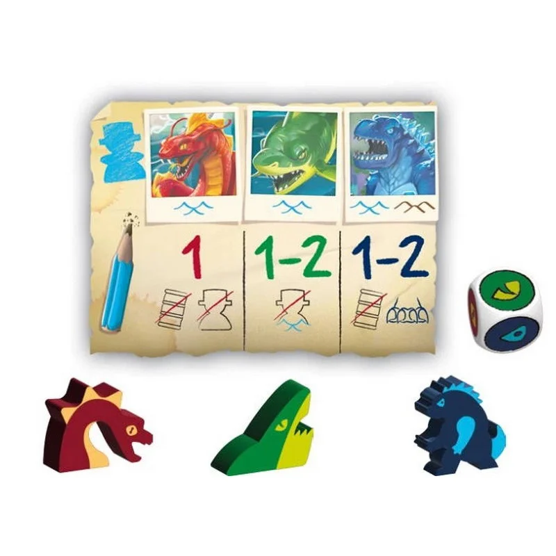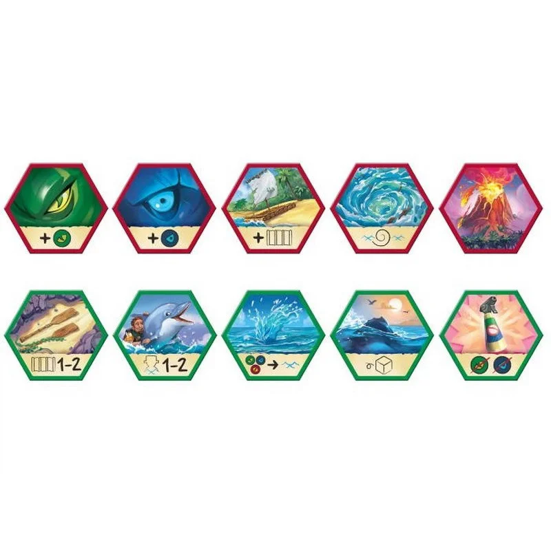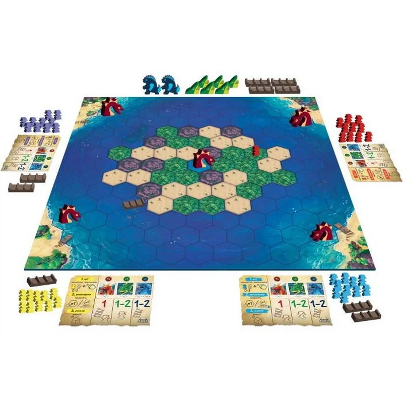 Вижити. Втеча з Острова (Survive: Escape from Atlantis!) - втеча від загибелі та боротьба за виживання на острові, що тоне. Вам колись доводилося тікати з острова, що потопає, але повного скарбів та небезпек? Якщо ні, тоді настільна гра Вижити. Втеча з Острова (Survive: Escape from Atlantis!)- ваш шанс випробувати це на собі. Але будьте готові до боротьби, де проти вас не тільки стихії та голодні морські істоти, а й ваші суперники, які теж не проти врятуватися з повними кишенями скарбів. Острів Атлантида йде під воду, руйнуючись на очах. Ваші дослідники повинні знайти вихід до безпечних берегів, але шлях буде непростий: небезпеки чатують на кожному кроці. Човни та плоти лише злегка полегшать шлях, а морські змії, акули та гігантські монстри роблять цю пригоду справжнім випробуванням на міцність та кмітливість. Хто з вас виявиться розумнішим, швидшим і хитрішим? Хто зможе вивезти свої скарби, поки острів занурюється у прірву? Оновлений хіт: що нового у цій версії гри? Хоча настільна гра Survive: Escape from Atlantis! вже кілька десятиліть, а саме з 1982 року, відома своїм захопливим ігроладом, ця версія пропонує більше: новий контент та баланс для досвідчених гравців. Введені кайджю - монстри, які можуть витісняти не тільки шукачів пригод, але й інших істот. Також доданий п'ятий гравець, що робить гру ще більш жорстокою та динамічною. Баланс став більш збалансованим: тепер властивості острівних плиток змінені, що додає тактичної глибини. Завершальні зміни роблять гру ще більш напруженою та стратегічною: наприклад, тепер ви можете стрибнути у воду прямо з берега, а гра закінчується після відкриття третього вулкана. Кожна деталь була відшліфована, щоб зберегти дух класичної версії і запропонувати свіжі, захопливі механіки для нових гравців. Напружені хвилини та неймовірна гонитва за порятунком У грі 2-5 гравців по черзі намагаються вивести своїх шукачів пригод із острова, який поступово занурюється в океан. Перед початком партії ви створюєте унікальний острів Атлантиди, випадково розкладаючи шестикутні плитки на ігровому полі. Ці плитки являють собою три види місцевості: піщані пляжі, джунглі та гірські вершини. Пляжі починають тонути першими, потім джунглі, і, нарешті, неминуче занурюються під воду гори - останній оплот дослідників, що зневірилися. Також поряд з полем розташовуються небезпечні істоти, що мешкають у морських глибинах: морські змії, акули та гігантські чудовиська кайдзю. Кожен гравець вибирає колір та отримує 10 фігурок шукачів пригод, які мають приховані значення - це кількість скарбів, які вони несуть. Гравці по черзі розміщують своїх шукачів на плитках острова, намагаючись не розкрити суперникам справжню цінність кожного персонажа. Після цього розміщуються плоти на вільних водних ділянках біля узбережжя і починається велика боротьба за виживання. Кожен хід гравця поділяється на три ключові фази: Переміщення шукачів пригод та плотів. У свій хід гравці можуть пересунути до трьох одиниць - це можуть бути кроки одного шукача або розділені між кількома. Пересування шукачів на суші та плотів морем проходить швидше, ніж плавання: на плоту можна перетинати відразу кілька клітин, а ось плавці можуть просунутися лише на одну клітинку за хід. Якщо на плоту є кілька фігурок різних гравців, право керування дістається тому, хто має більше фігурок на цьому плоту. Якщо ж кількі