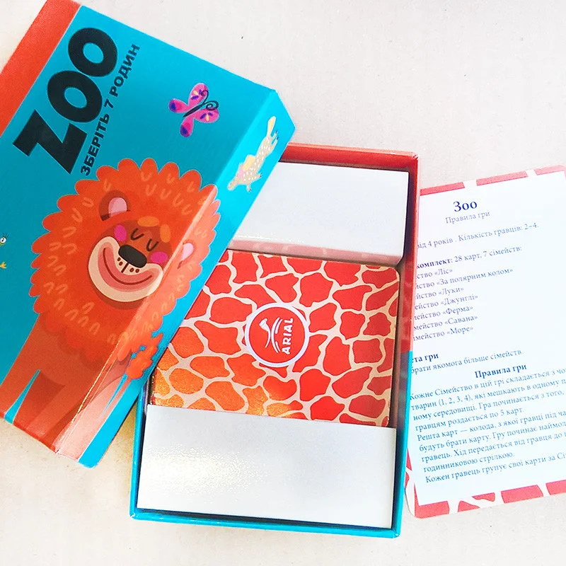 Динамічна настільна гра Arial Зоо 911326, розрахована на веселу компанію від 3-х учасників, стане ідеальним способом, щоб відволікти дитину від гаджетів і комп'ютерних ігор. Призначений для діток дошкільного віку від 4-х років, захоплююча забава занурить дитину в захоплюючий процес складання сімейств тварин. Така гра відмінно підійде для спільного сімейного дозвілля, дитячих свят, допоможе створити приємну, змагальну атмосферу. Грати в цю настільну гру можна і вдома, і в дитячому центрі, а завдяки компактному впакуванні її зручно брати з собою в поїздки. В ході гри кожен з учасників повинен максимально швидко скласти з карток сім'ю тварин. Той, хто впорається із завданням першим, і стає переможцем. У набір входить 28 красивих, гральних карток, а також детальна інструкція для початківців. Яскраве оформлення та подарункова упаковка роблять комплект вдалим вибором в якості презенту, який буде доречний для будь-якого свята.