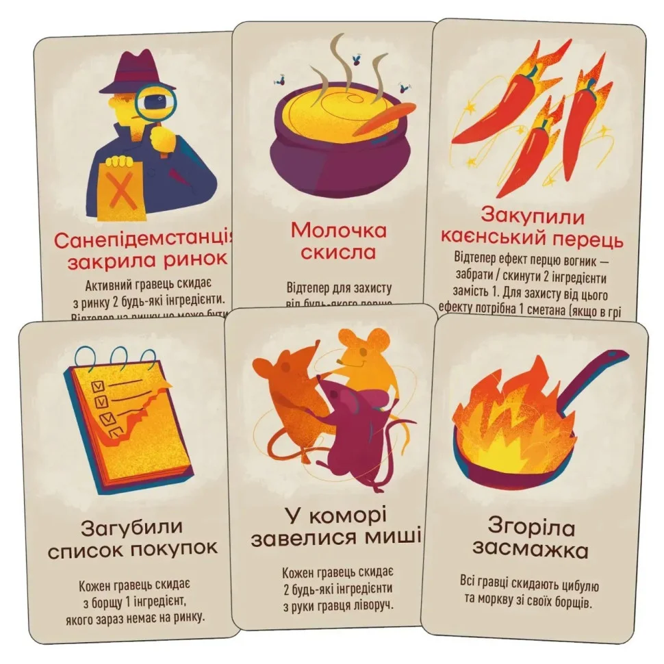 На початку партії кожний гравець повинен обрати свій борщ: це може бути страва з грушами, квасолею, або навіть рибою. Але якщо картоплю знайти досить просто, та й коштує вона не багато, то чорнослив на ринку ще треба пошукати. Саме тому у свій хід ви можете поміняти кілька будь-яких продуктів з руки на один більш дорогий з ринку, кілька дешевих з ринку на один дорогий власний, або просто добрати карти з колоди.