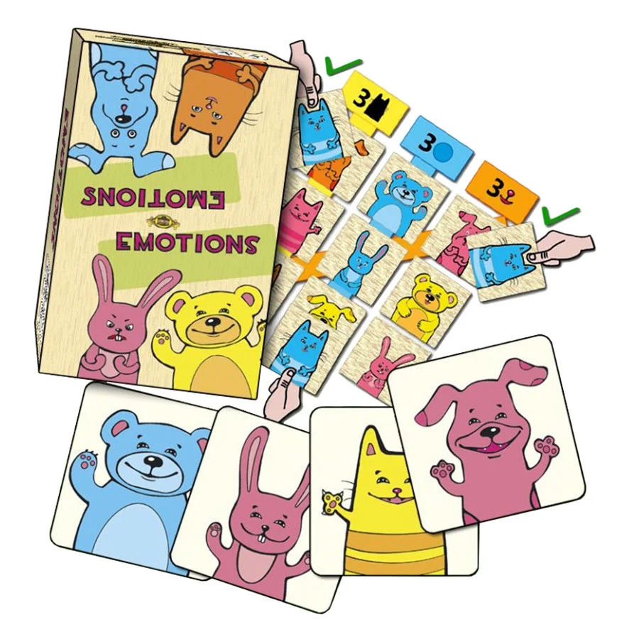 У комплекті 64 картки, зображення на кожній з них відрізняється від інших 3 ознаками: звіром (заєць, ведмедик, кіт, собака); емоцією (радість, здивування, гнів, гарний настрій); кольором (синій, жовтий, рожевий, оранжевий).