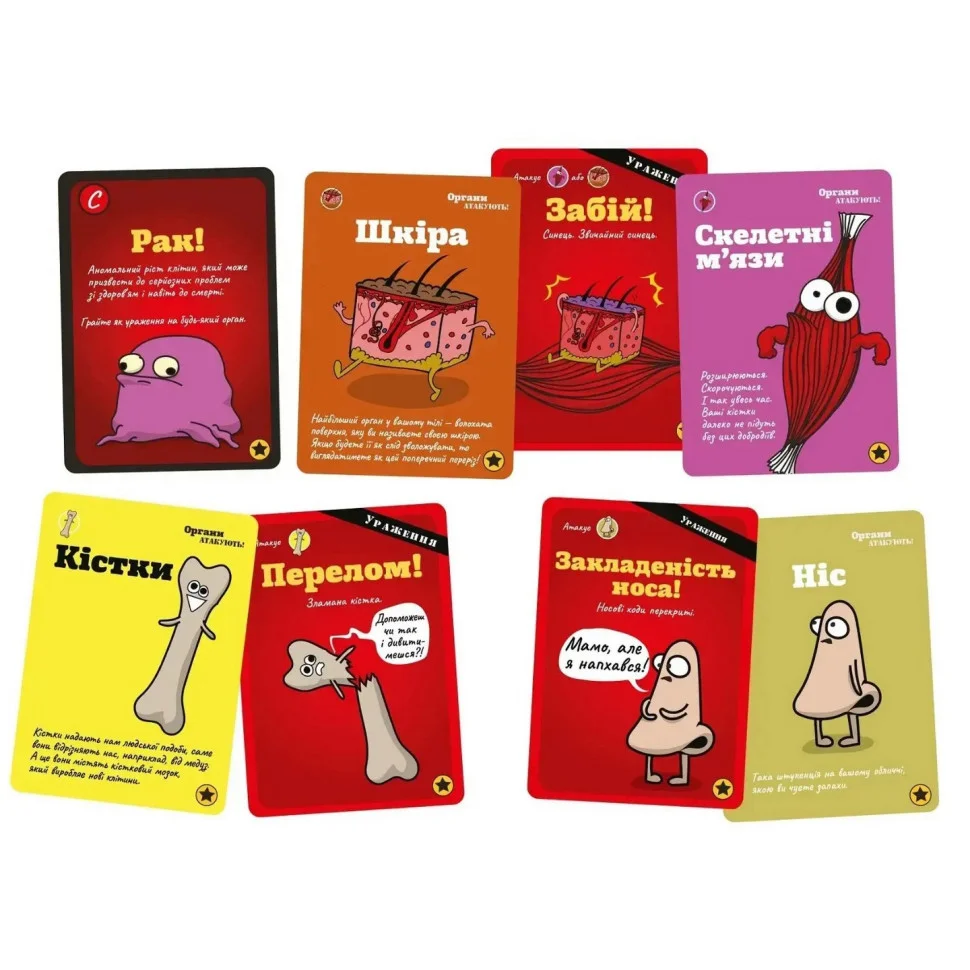 Картки органів, хвороб, некрозу, захисту та подій; ілюстрації від Awkward Yeti; коротка довідка по бацилах.