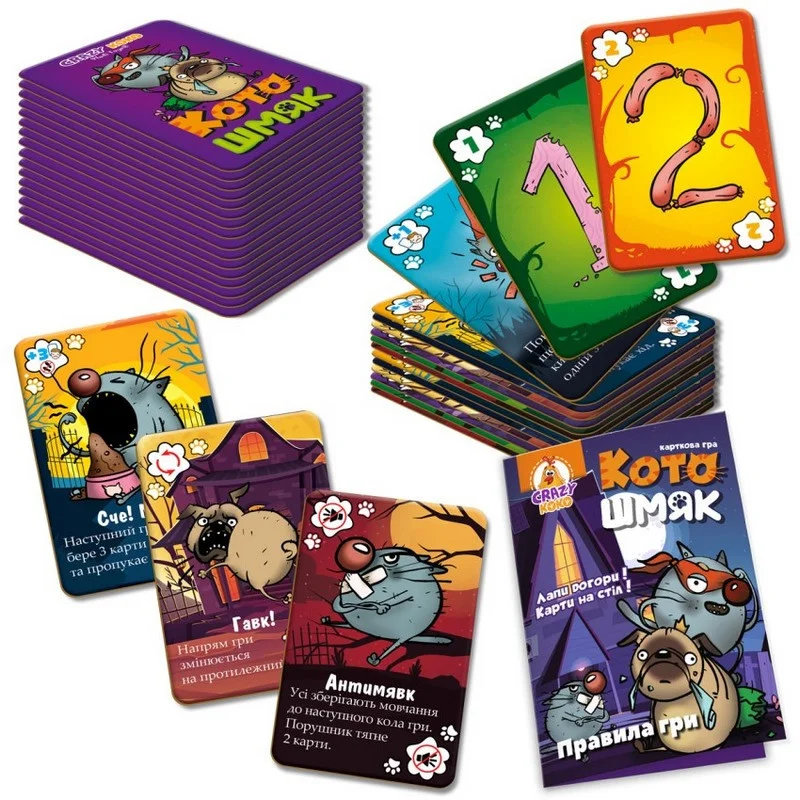 Лапи догори! - Карти на стіл! "Котошмяк" - це динамічна карткова гра, яка миттєво захоплює і дітей, і дорослих. Ідеальний вибір для сімейних вечорів, дружніх зустрічей або поїздок - компактний формат зручно брати з собою куди завгодно.