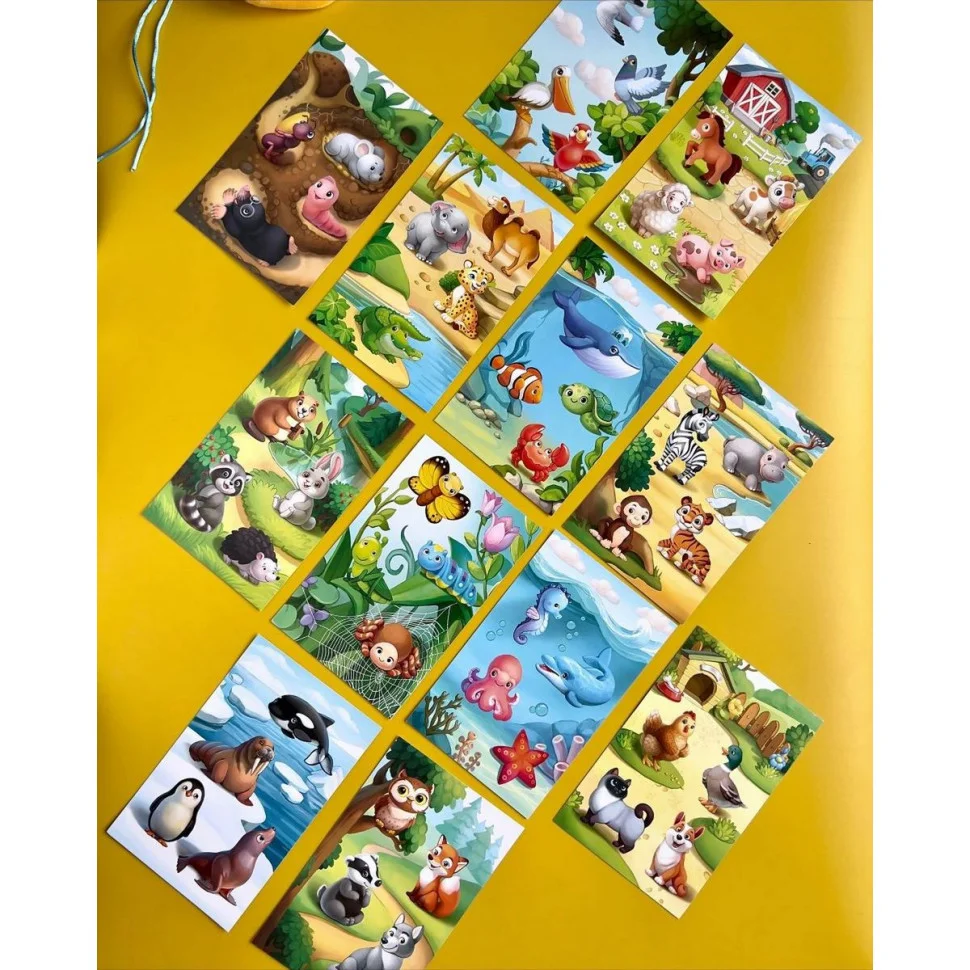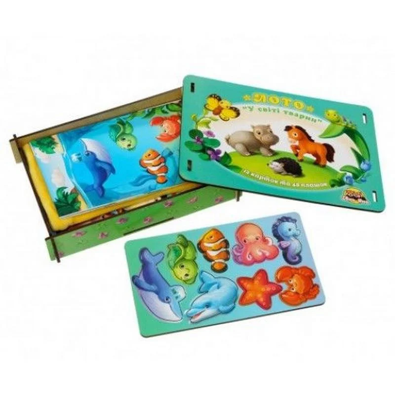Перед Вами - лото для малюків під назвою "У світі тварин". У яскравій коробочці Ви знайдете: 48 фігурних фішок та 12 ігрових карток-полів: комахи, підземні жителі, птахи, підводний світ, домашні тварини, лісові жителі, тварини пустелі і африканських джунглів, а також мешканці Арктики і Антарктики. Як грати: необхідно роздати всім учасникам по ігровому полю, на якому зображені різні тварини. Усі фішки в той же час потрібно покласти у мішечок (йде у наборі) та перемішати. Кожен гравець повинен по черзі діставати фішки. Якщо у когось з гравців виявиться малюнок ідентичний малюнку на фішці - він забирає її собі і накриває фішкою свою тваринку на картці. Виграє той, хто першим накриє своє ігрове поле.