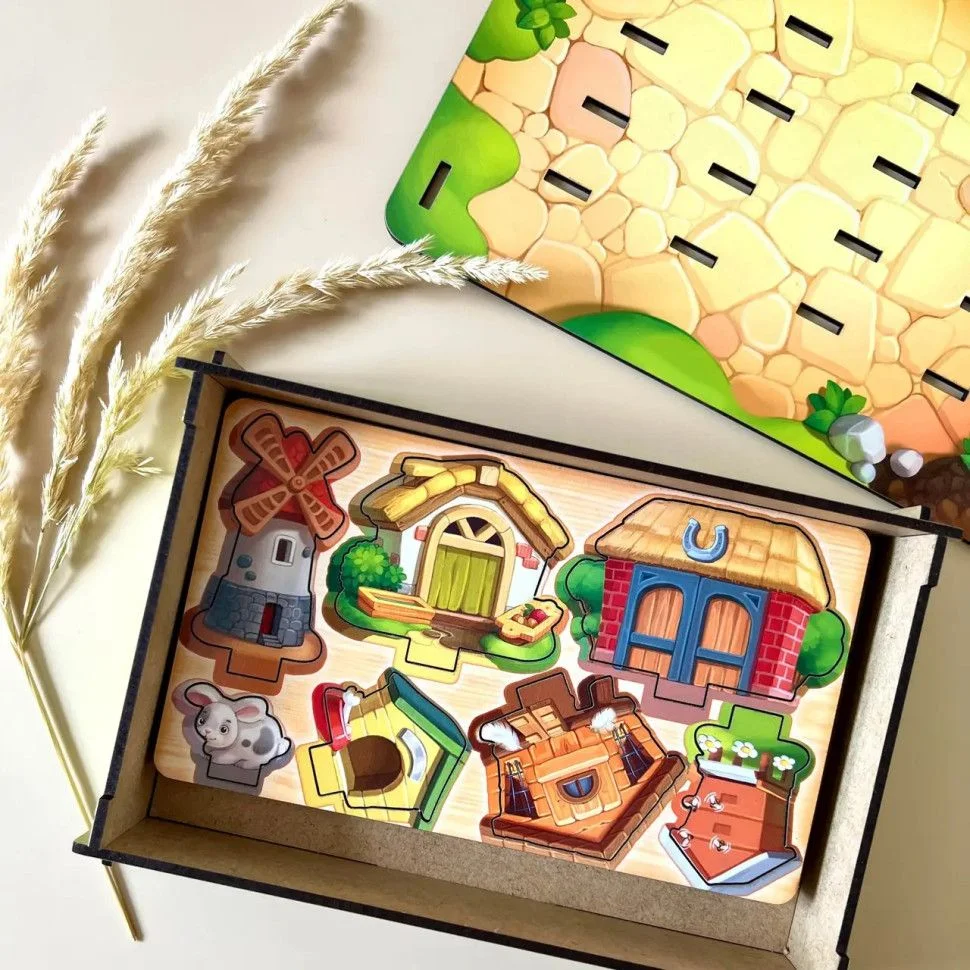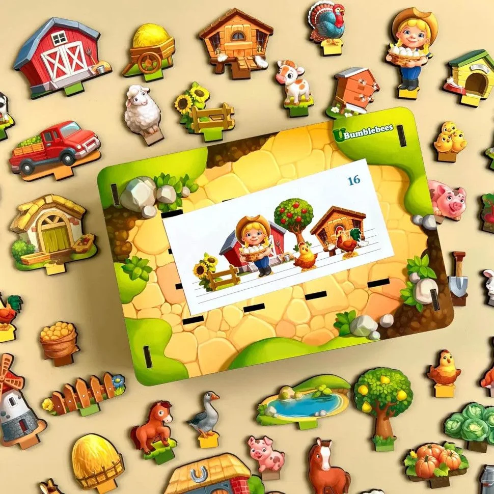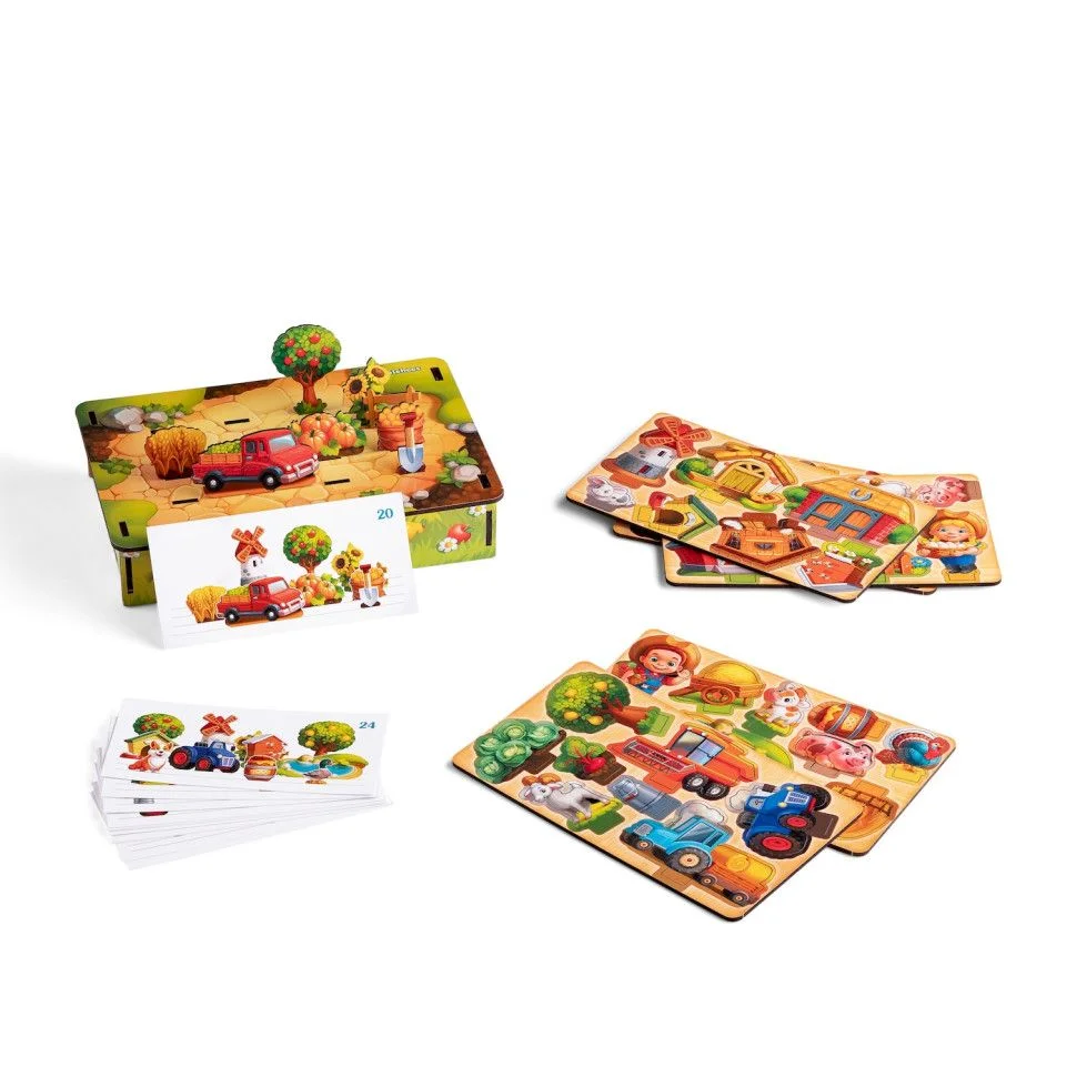"Панорама: ферма" - це перехід від площини до об'ємного сприйняття дитини. Гра - тренажер для моторики рук, завдання - вставити фігурку під прямим кутом. Непосиди навчаться концентруватися, орієнтуватися у просторі, розвинуть глазомір і збагатять словниковий запас. За допомогою карток-схем дитина створить картину, розвине сюжет, складе коротку розповідь на тему. Відмінний посібник для вивчення прийменників: постав корову праворуч від кошика і перед парканом.