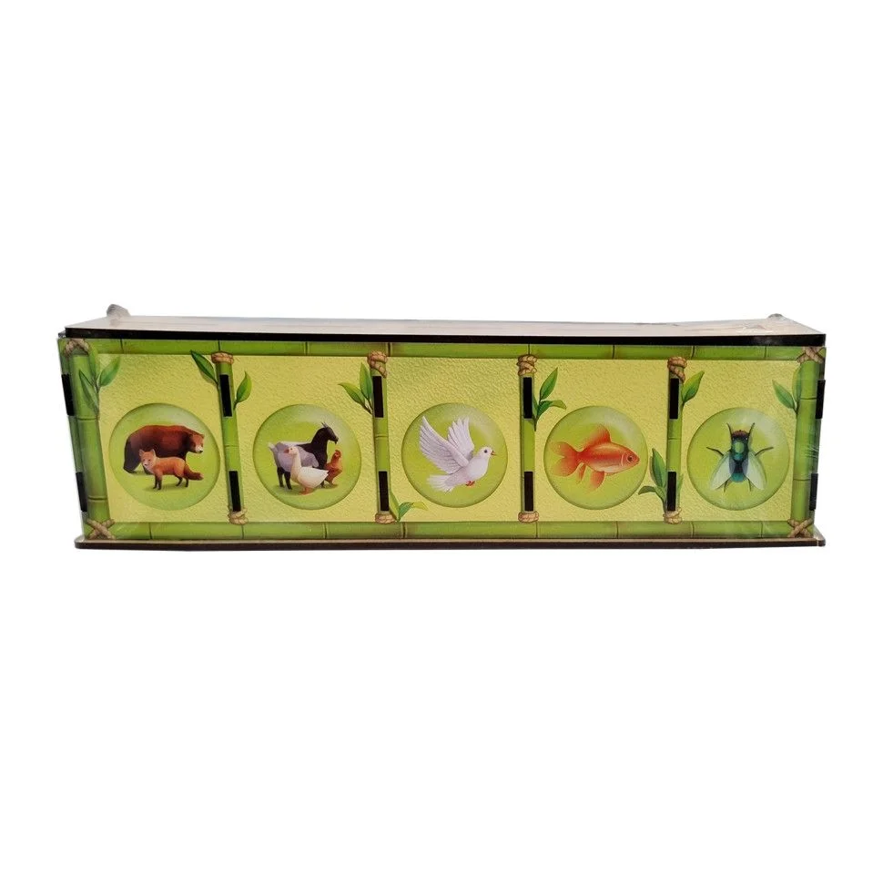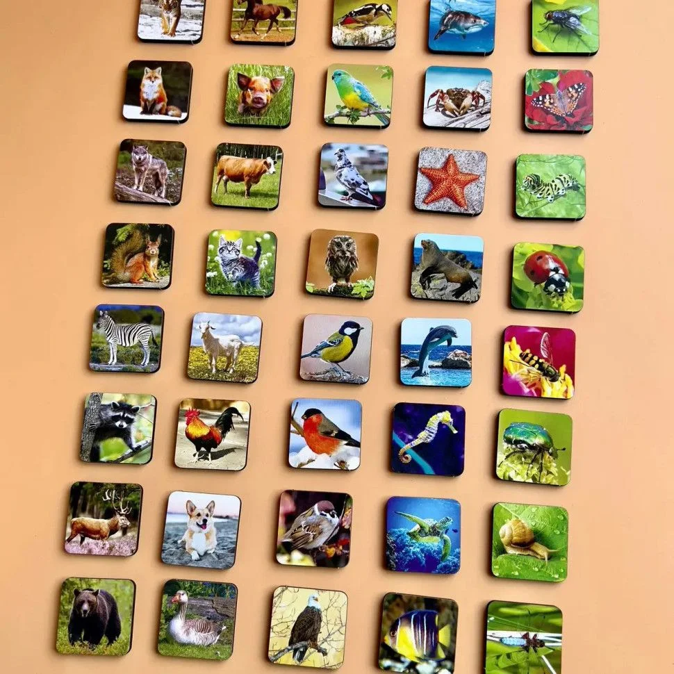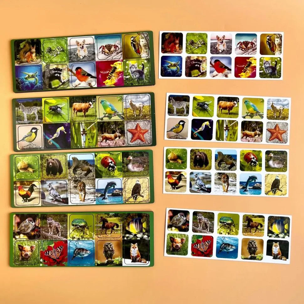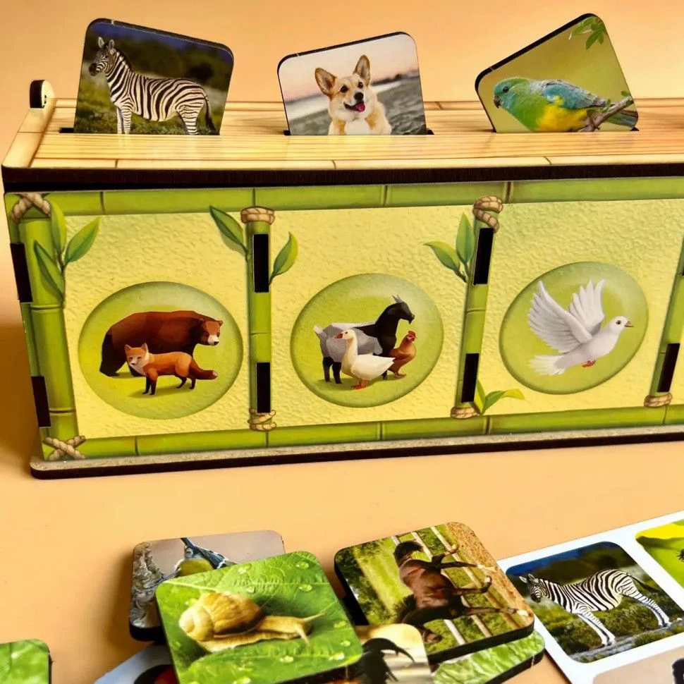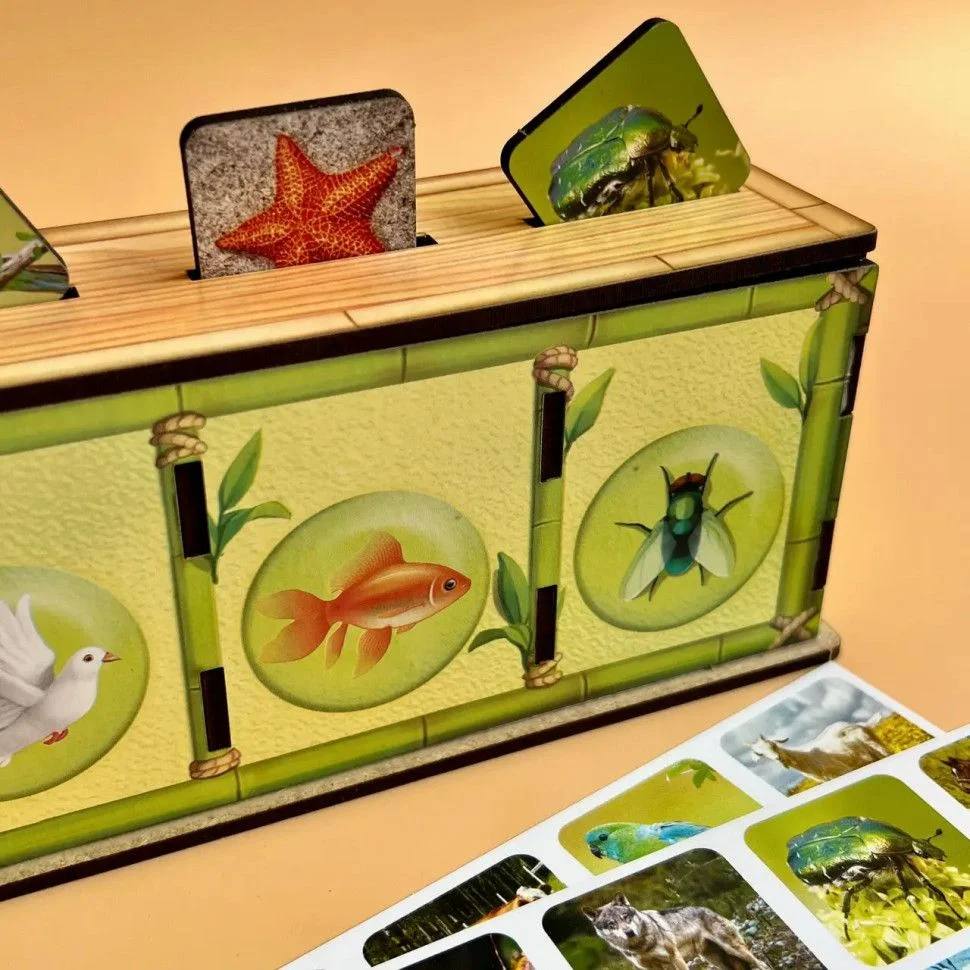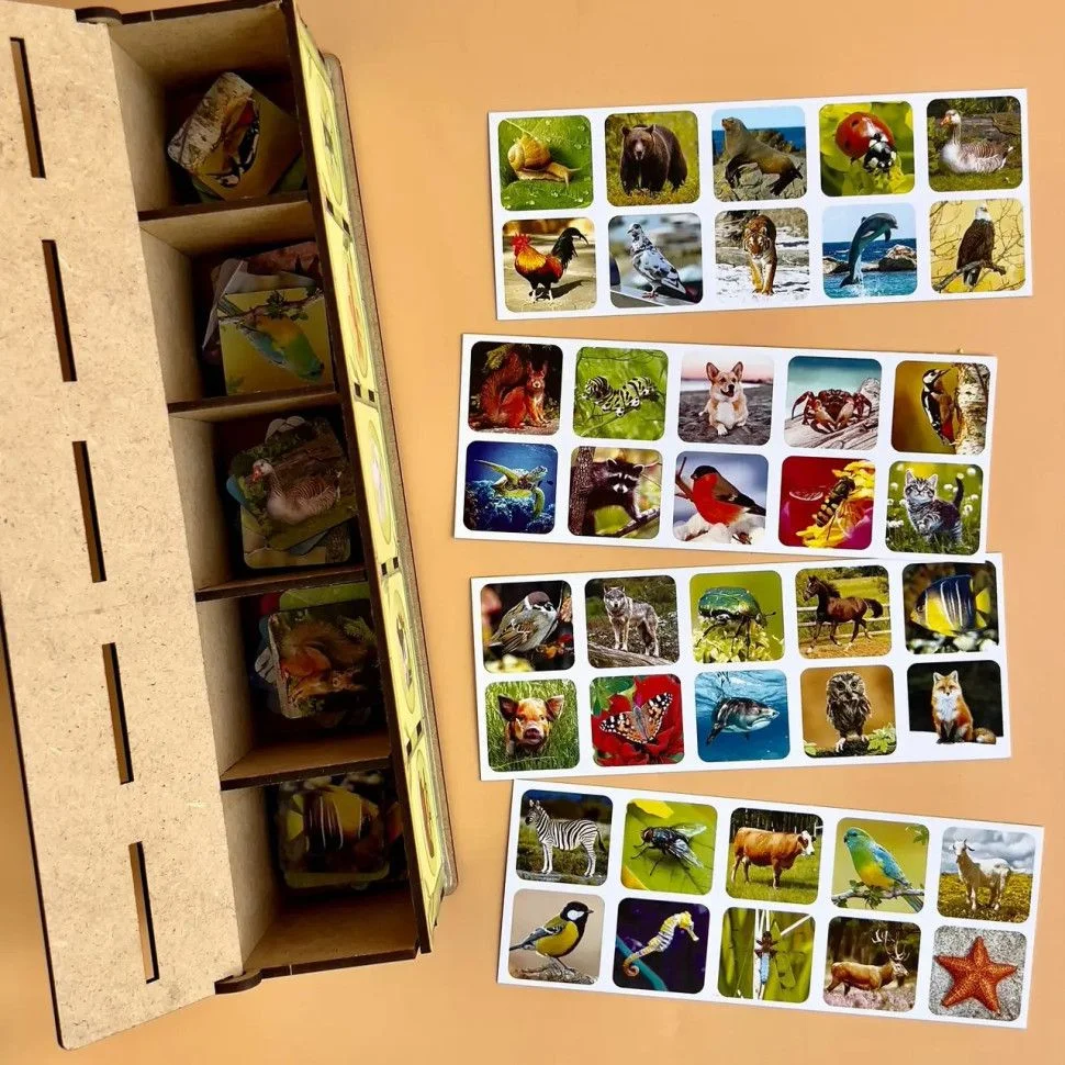Комплект, до якого входять: дерев'яна коробка розміром 29 х 8,8 х 9 см., що розділена на 5 тематичних скриньок з різними видами тварин: морські, домашні, дикі, комахи, птахи. 40 плашок з реалістичними малюнками для сортування та 4 картки 18 х 7 см. для гри плашками у Лото, так можна не лише сортувати, а й грати у лото.