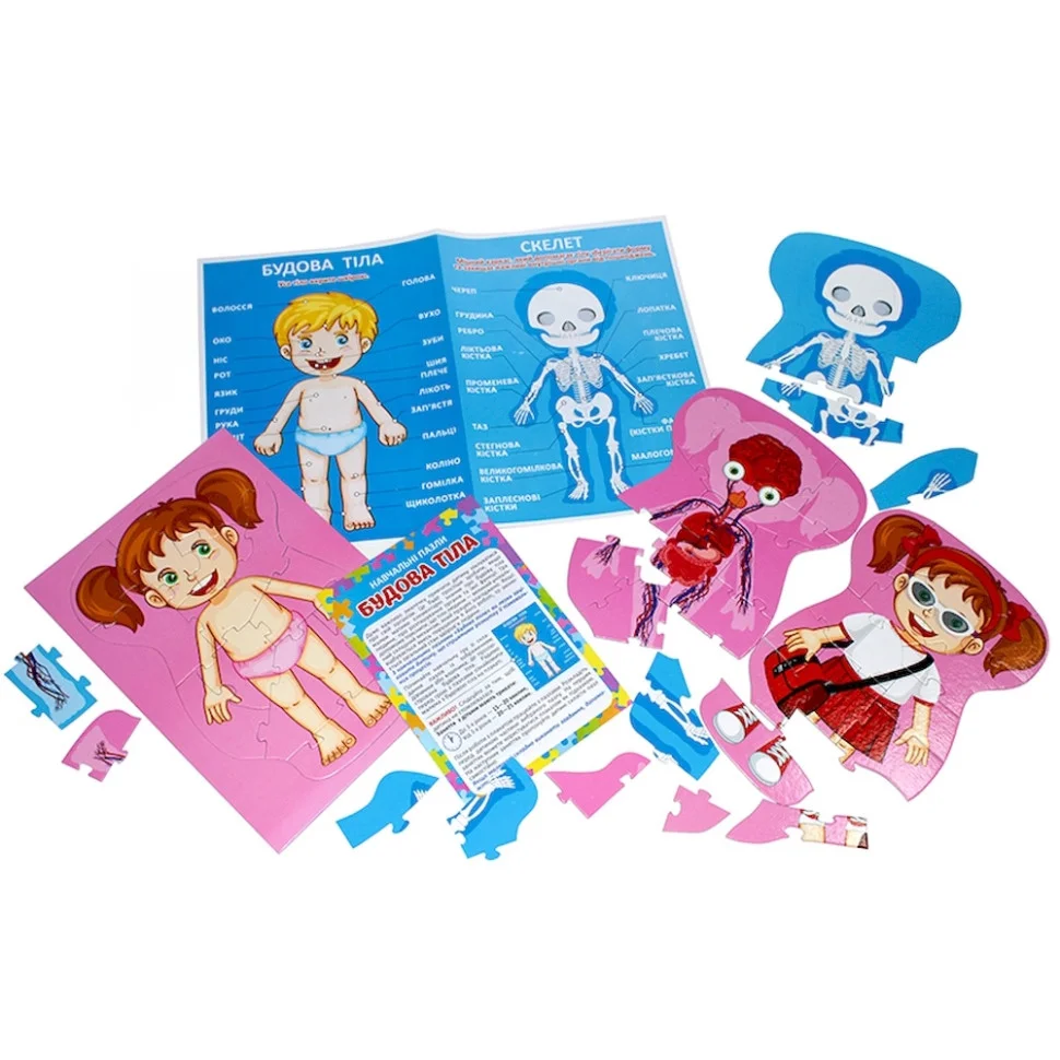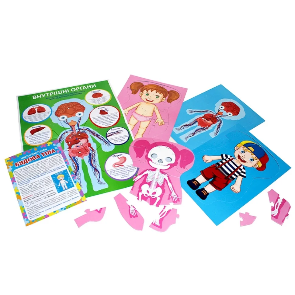 Дуже важливо змалечку привчити дитину піклуватися про свій організм. З пазлами «Будова тіла» ви легко зацікавите дитину і перетворите навчання на захопливу гру. Розпочинаємо складати пазли, попередньо ознайомивши малечу з будовою тіла зображену на плакаті набору. Кожна картинка-пазл складається з різної кількості деталей і відрізняється рівнем складності. Пазли двосторонні виготовлені з високоякісного матеріалу, зображення не стираються, не ламаються, що дозволяє збирати картину-пазл знову і знову.