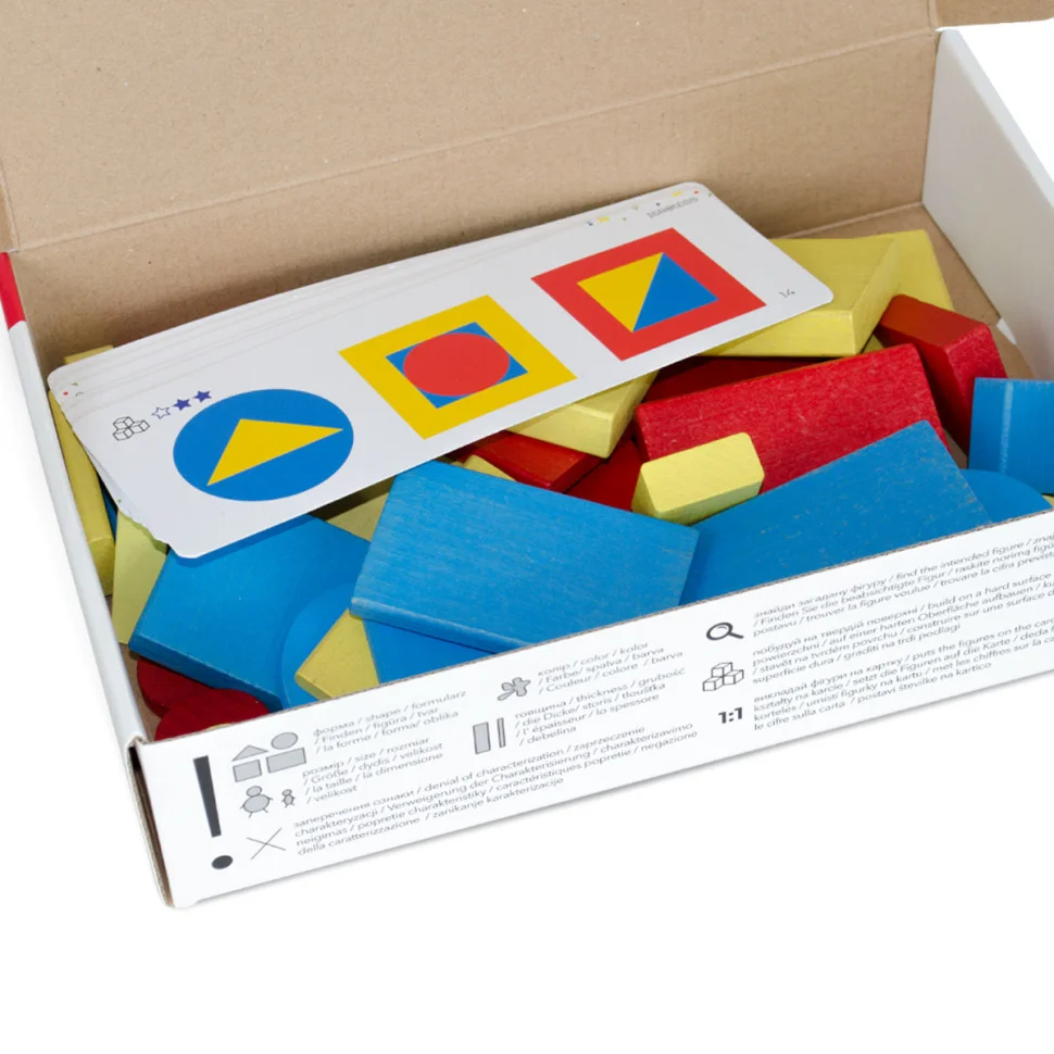 - 48 фігур, кожна з яких відрізняється від інших за чотирма параметрами - форма, колір, товщина, величина
