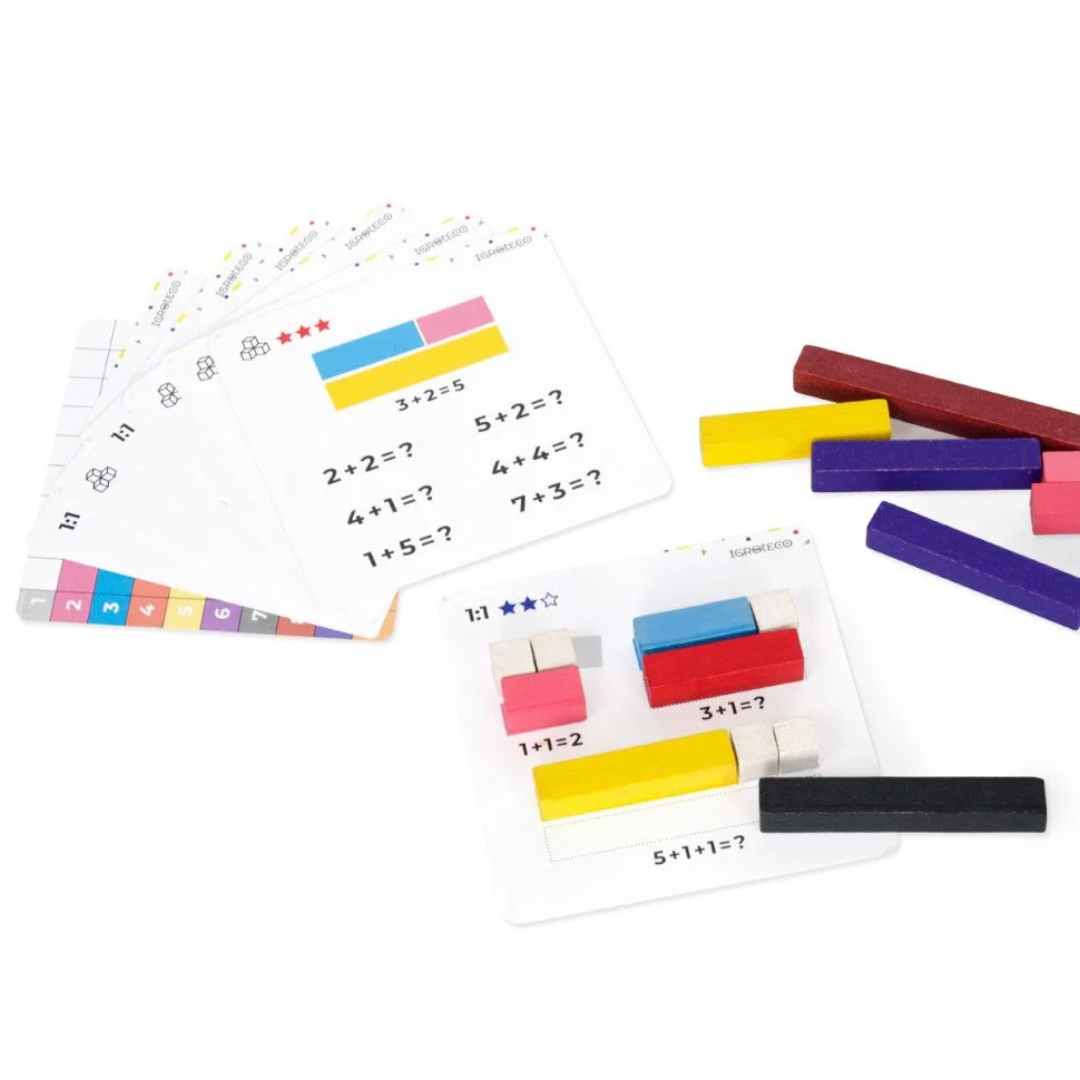 Дерев'яні рахівні палички за методикою Кюїзенера (56 шт + 10 двосторонніх карток із завданнями) - це універсальний дидактичний матеріал для розвитку математичних здібностей у дітей. Називають їх по-різному - набір паличок для лічби, "числа в кольорі", "кольоровими паличками", "кольоровими числами".