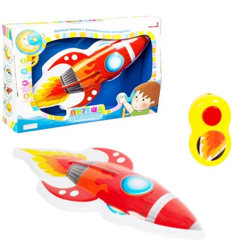 Нічник в формі ракети. Є кілька режимів роботи: тільки світло, тільки звук, світло та звук (звук - тихий шум). З приємними колисковими. Нічник можна зафіксувати на стіні, а вмикати / вимикати за допомогою пульта. Розмір ракети - 36х17 см. Ракета працює від 3-х батарейок АА, пульт - від 2-х батарейок ААА. Написи на коробці російською.