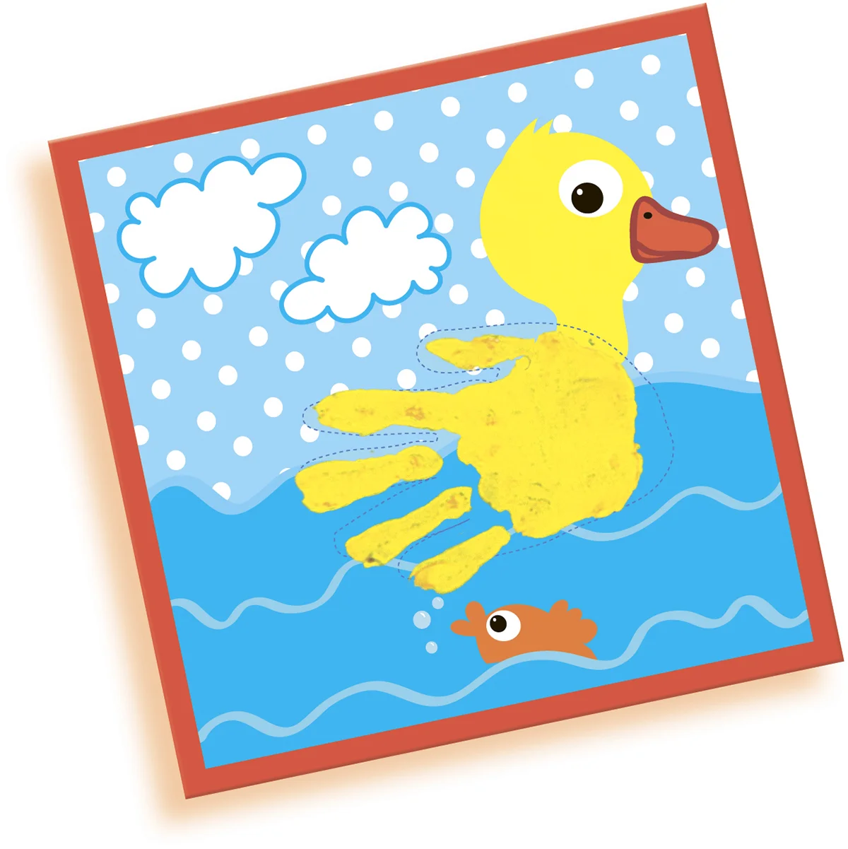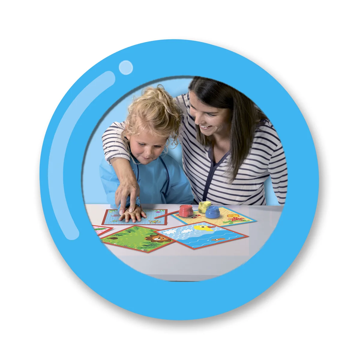 - Набір для малювання включає в себе веселі друковані картки, що вказують де малюк повинен поставити свій кольоровий відбиток.