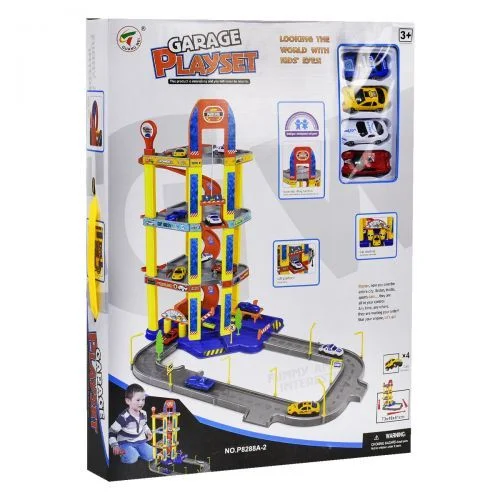 Чотирьохрівневий паркінг. На верхні поверхи парковки можна дістатися по крутому серпантину. На нижньому рівні - заправка та автомийка. 4 пластикові машинки в комплекті. Розмір конструкції в зібраному вигляді - 73х48х61 см.