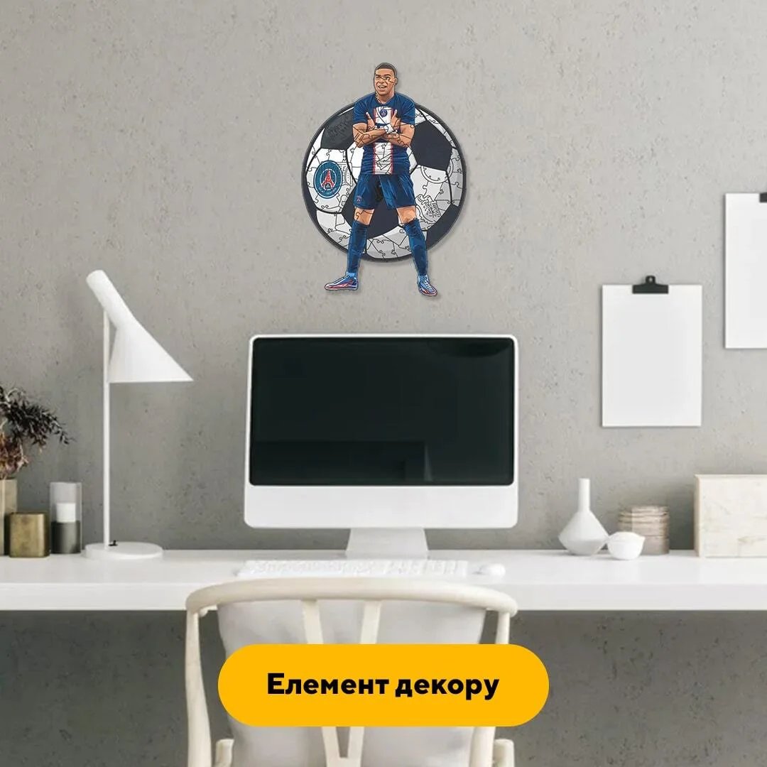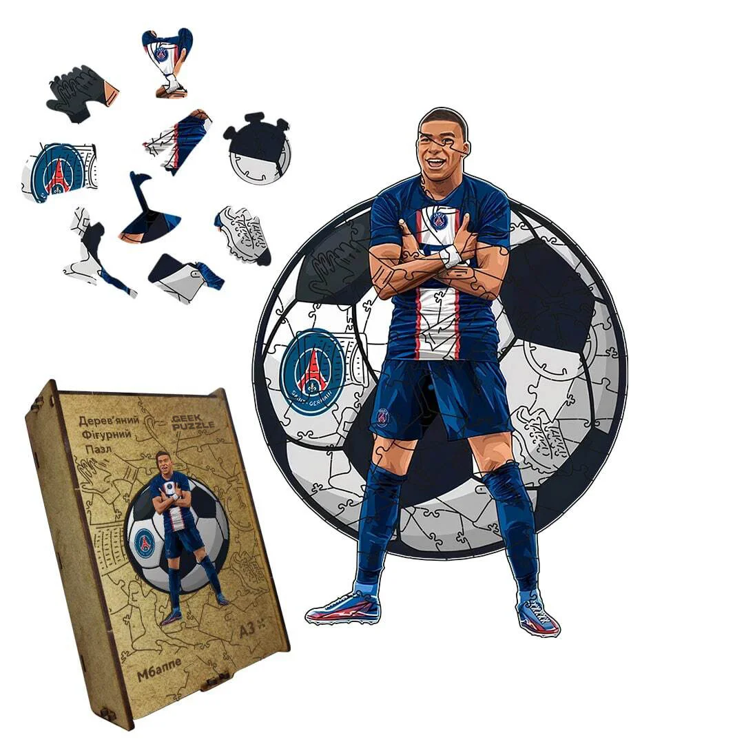 Пазл дерев'яний 'Мбапе': створіть своє власне мистецьке втілення захоплюючого стилю та неперевершеної майстерності футбольного гравця Кіліана Мбапе, складаючи цей образ з дерев'яних частинок.