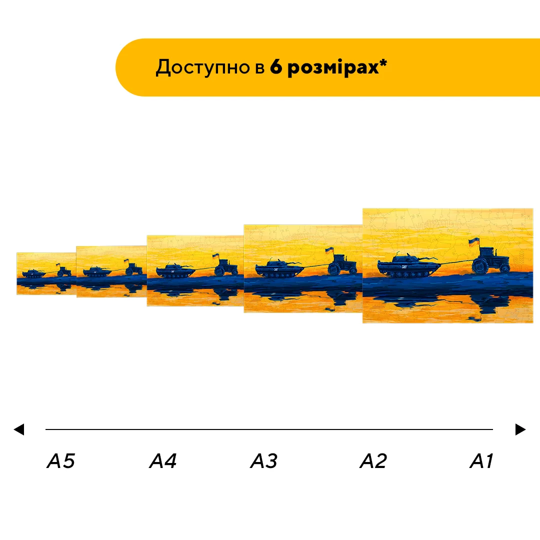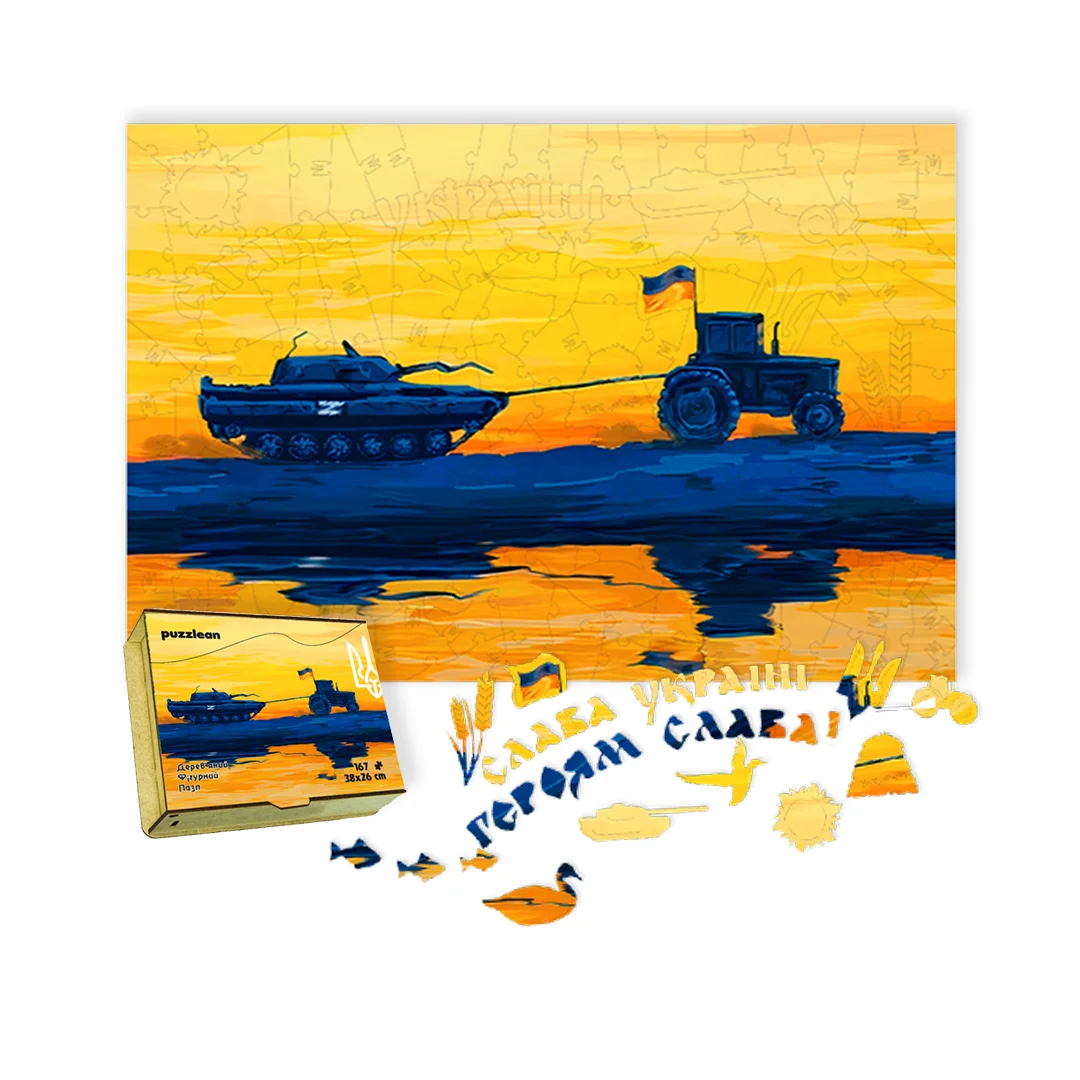 Пазл дерев'яний 'Трактор тягне танк': зіберіть цей захоплюючий момент людської відваги та наснаги у вашому власному домі!