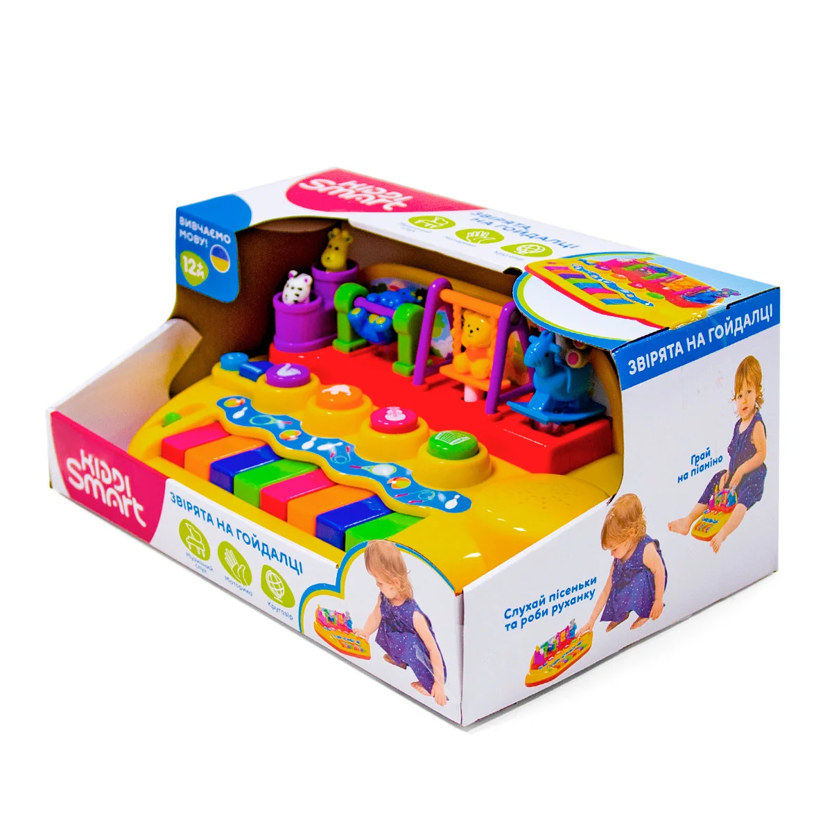 Піаніно Звірята на гойдалці - яскрава та цікава іграшка, яка озвучена українською мовою! З цим чарівним піаніно малюк не тільки зможе насолодитися грою на музичному інструменті під захопливий рух кумедних тваринок, а і послухати пісеньки та віршики українською мовою, дізнатись про корисні навички здорового способу життя і навіть… зробити справжню веселу руханку!