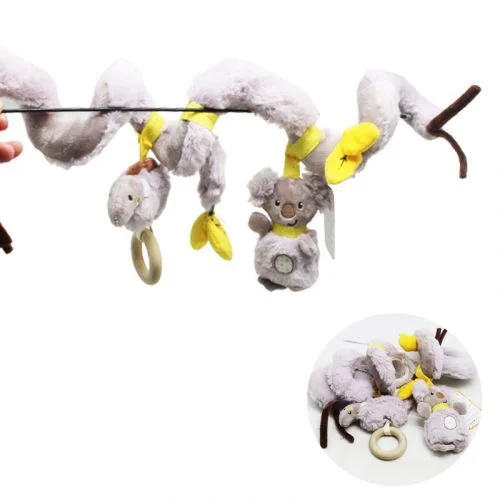 Плюшева підвіска на ліжечко чи коляску. Виконана з дуже м'яких і приємних на дотик тканин. До спіралі прикріплено дві м'які іграшки - динзаврик-брязкальце та коала, яка відтворює музику, якщо на неї натиснути. Також на підвісці можна знайти різні розвиваючі елементи: дзеркальце, шелест і кільце-брязкальце. Довжина спіралі: 53 см. Кріпиться за допомогою зав'язочок.