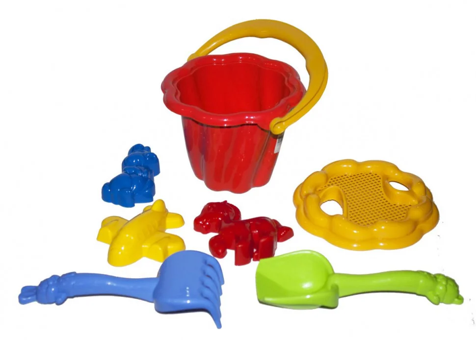 У комплекті: відерце, сито, лопатка, грабельки і три пасочки.