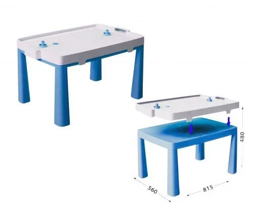 Пластиковий стіл 2 в 1. Легко складається. Виготовлений з якісного пластику (поліпропілену). Можна збирати як стіл з ігровою панеллю для аерохоккея, або як звичайний столик. Також в комплекті є 2 біти і 2 шайби для гри. Гравці стають по різні боки столу і за допомогою біт для аерохоккея намагаються потрапити шайбою у ворота супротивника. Розмір столу: 56 х 81,5 х 48 см.