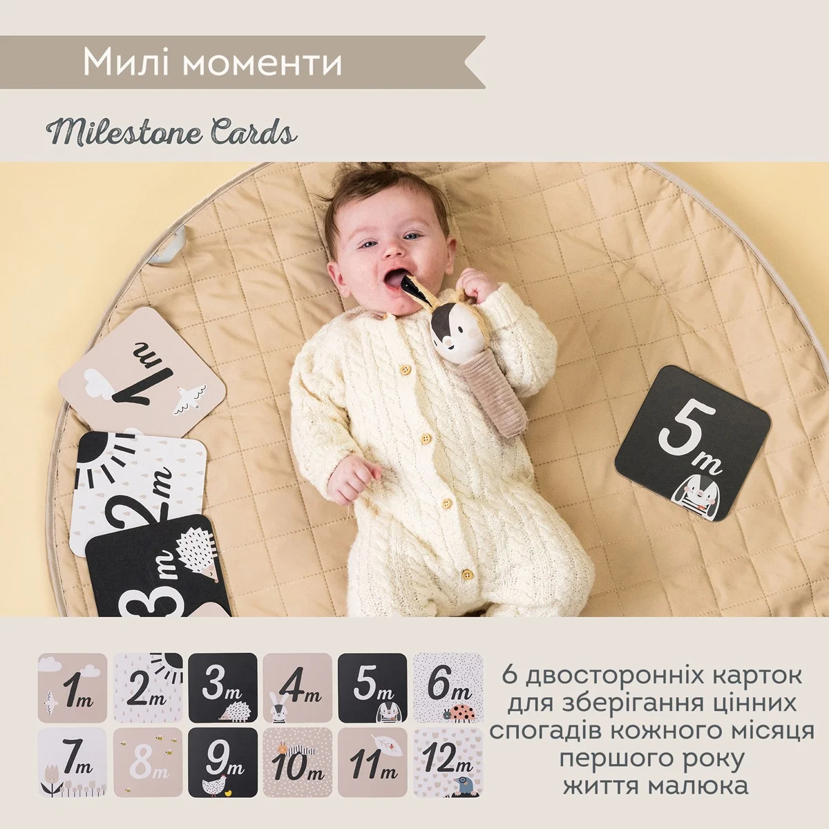 - 6 двосторонніх карток для зберігання цінних спогадів кожного місяця першого року життя малюка