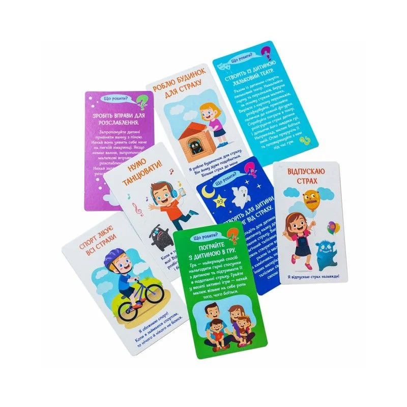 Картки, що містяться в наборі, пропонують цікаві і веселі вправи, які допоможуть вашій дитині наважитися та подолати свої страхи. Дитина, яка має змогу вільно розповісти дорослим про свої страхи, швидше їх подолає.