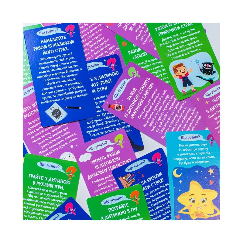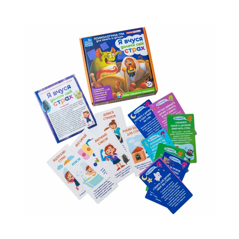 Картки, що містяться в наборі, пропонують цікаві і веселі вправи, які допоможуть вашій дитині наважитися та подолати свої страхи. Дитина, яка має змогу вільно розповісти дорослим про свої страхи, швидше їх подолає.