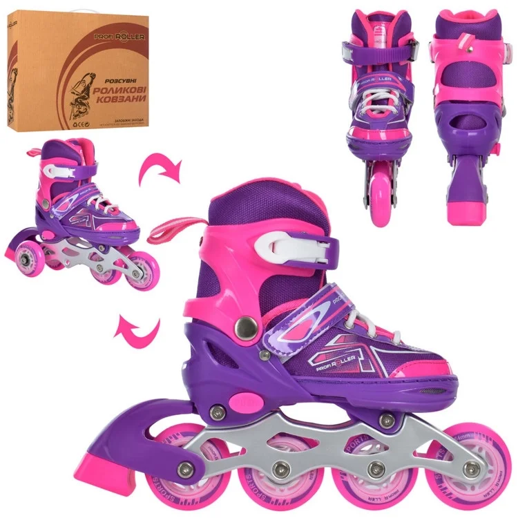 Розсувні дитячі роликові ковзани для початківців ролерів. Катання на роликових ковзанах допоможе розвинути у дитини координацію рухів і почуття рівноваги. Зручний високий напівм'який черевик добре сидить на нозі і не дасть нозі вискочити під час катання, а також захищає ногу від травм. Вентильований лайнер дозволяє нозі дихати. Корпус виготовлений з високоякісного полімеру і оснащений міцною алюмінієвою рамою і поліуретановими колесами. Система регулювання на 4 повних розміру дозволить вашій дитині кататися кілька сезонів, тим самим економити ваші гроші.