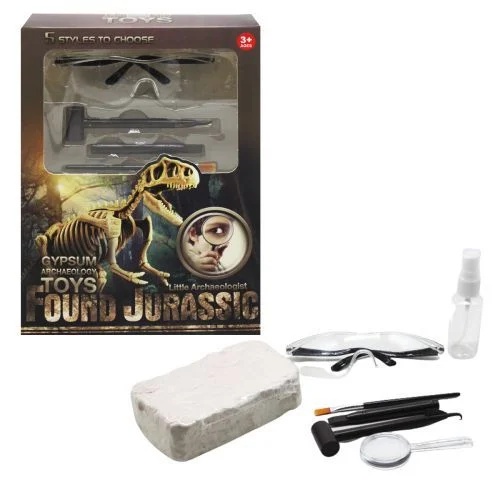 У цій коробці знаходиться пласт скам'янілої земної породи з копією скелета динозавра, а також археологічний набір інструментів, необхідних для проведення розкопок, і захисні окуляри. Виконаний з якісних і безпечних матеріалів. Для дітей від 3-х років. Різні види в асортименті.