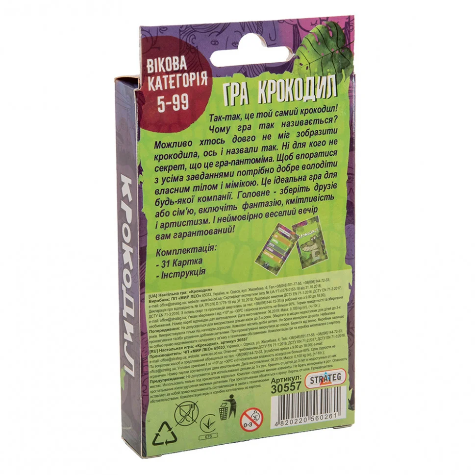 Захоплююча розвага для компанії - знаменита гра «Крокодил» (Strateg 30557) викличе веселощі з перших кроків. Зможе зацікавити не тільки дітей, а й дорослих, дасть можливість цікаво провести час всій родині, при цьому розвинути уважність, проявити свої здібності і розважитися. Завдання гри - вгадати предмет або дію загадану ведучим. Веселий сміх при цьому гарантовано! На початку, за вибором один з гравців стає ведучим, вибирає картки із завданнями і жестами описує предмет або яку-небудь дію Гравець першим правильно відповів на питання отримує можливість стати ведучим, при неправильній відповіді він повинен передати хід іншому гравцеві. На кожній картці наведені 5 питань. Грати можна командами. Правила прості, але гра захопить учасників з першої партії. Мова українська.