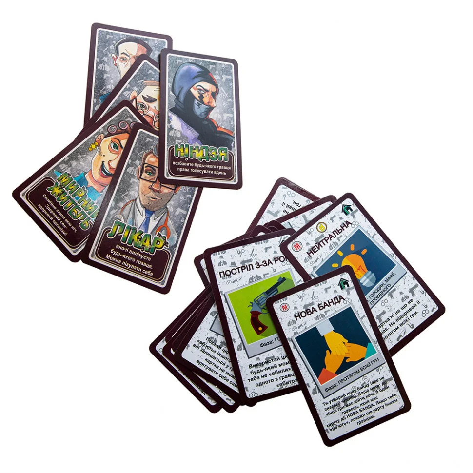 «Мафія» давно відома і всіма улюблена настільна гра, яка підходить для великих і не дуже компаній. Рольова гра з психологічним ухилом дозволяє не тільки весело і цікаво провести час в компанії друзів, але і дає можливість дитині розкрити свої таланти в невимушеній і дружній обстановці. Після призначення ведучого і розподілу ролей починається найцікавіше. Хто переможе у вічній сутичці між добром (мирні жителі) і злом (мафія) залежить від кожного гравця. Настільна гра «Мафія» (Strateg 00314) дозволяє задіяти від 4 до 16 осіб. Ілюстровані картки роблять гру більш насиченою та емоційною. На свій розсуд гравці вибирають варіанти гри - це може бути класична гра або розширена з діями, запропонована комплектація дозволяє використовувати обидва варіанти. Для тих, хто грає вперше або трохи забув правила, передбачена докладна інструкція, в якій можна знайти правила гри і повний опис ролей. В ігровому процесі активно задіяні розумові процес і уяву, розвивається логічне мислення, аналітичні здібності, уважність і спостережливість. Вік: від 8 років Матеріал карток: картон Кількість гравців: від 7 до 16 осіб В комплекті: 16 карток з персонажами (1 ведучий, 3 мафіозі, 1 перевертень, 1 маніяк, 1 жінка-кішка, 1 ніндзя, 1 доктор, 1 комісар , 1 детектив, 1 шпигун, 4 мирних жителя) і 26 карток діями і інструкція Розмір упаковки: 22х18х5 см