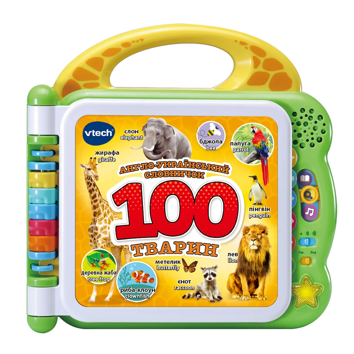 Досліджуйте тварин з різних куточків світу із розвивальною іграшкою - АНГЛО-УКРАЇНСЬКИЙ СЛОВНИЧОК - 100 ТВАРИН! Ця барвиста книжка з картинками та словами допоможе малюку вивчити тваринок світу у веселій ігровій формі. Іграшка дає чудову можливість батькам провести час з малюком, а також перевірити свої знання з англійської або разом із дитиною весело повторити слова. Щоб почути їх – просто натисніть пальчиком на зображення. Досліджуйте, вивчайте й грайте!