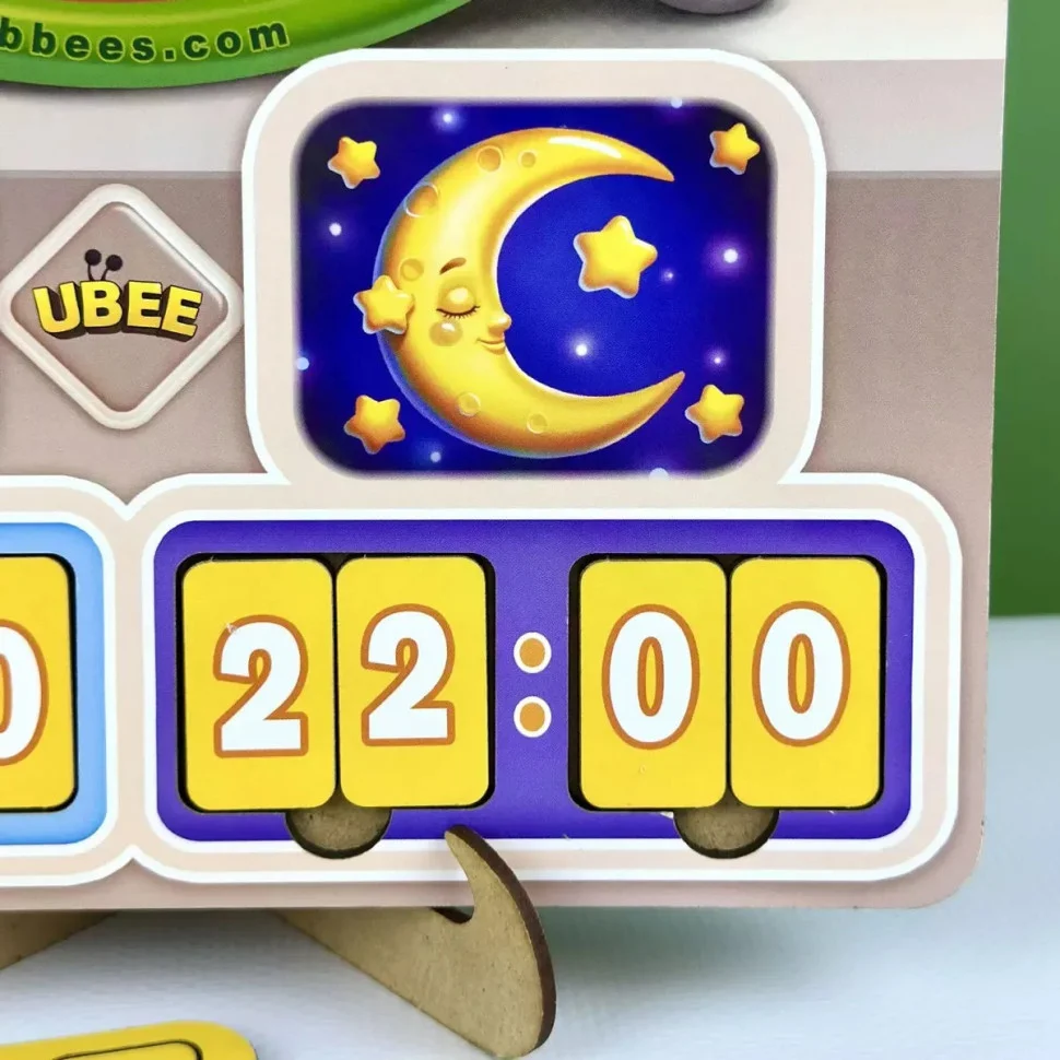 У наборі: деревʼяний інтерактивний годинник, циферблат якого розбирається, цифри та 30 завдань різної складності, такі як: