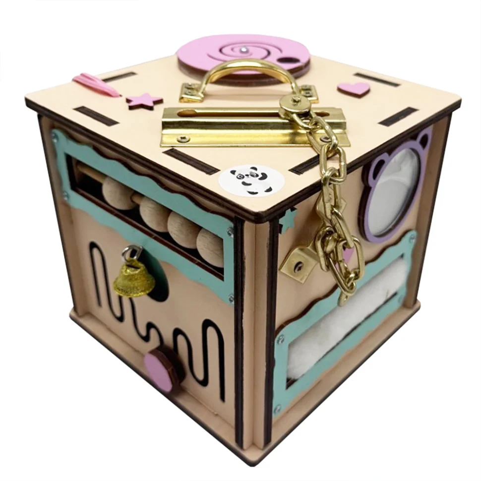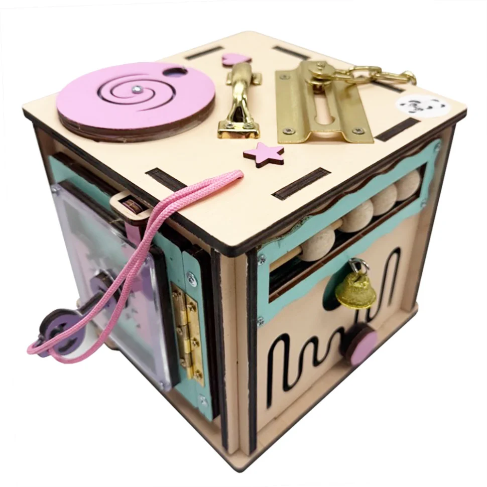 Бізікуб має багато цікавих деталей, що сприяють всебічному розвитку дитини. Він виготовлений із якісних, безпечних матеріалів, що пройшли всі необхідні сертифікації. Усі частини, включно з рухомими елементами, міцно закріплені, що гарантує надійність і безпеку іграшки.