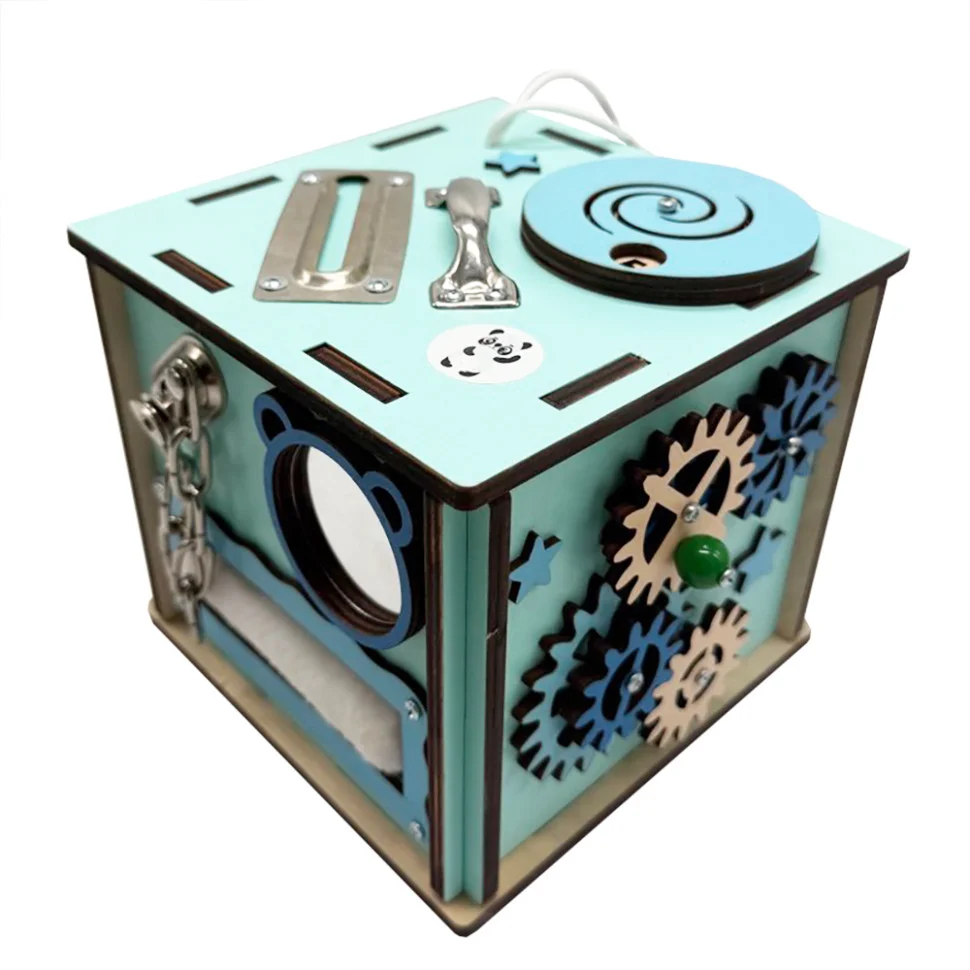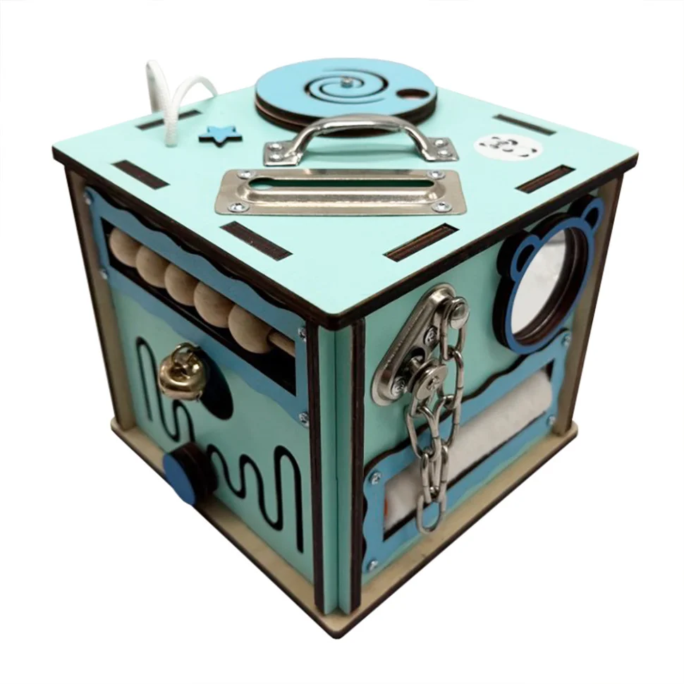 Бізікуб має багато цікавих деталей, що сприяють всебічному розвитку дитини. Він виготовлений із якісних, безпечних матеріалів, що пройшли всі необхідні сертифікації. Усі частини, включно з рухомими елементами, міцно закріплені, що гарантує надійність і безпеку іграшки.
