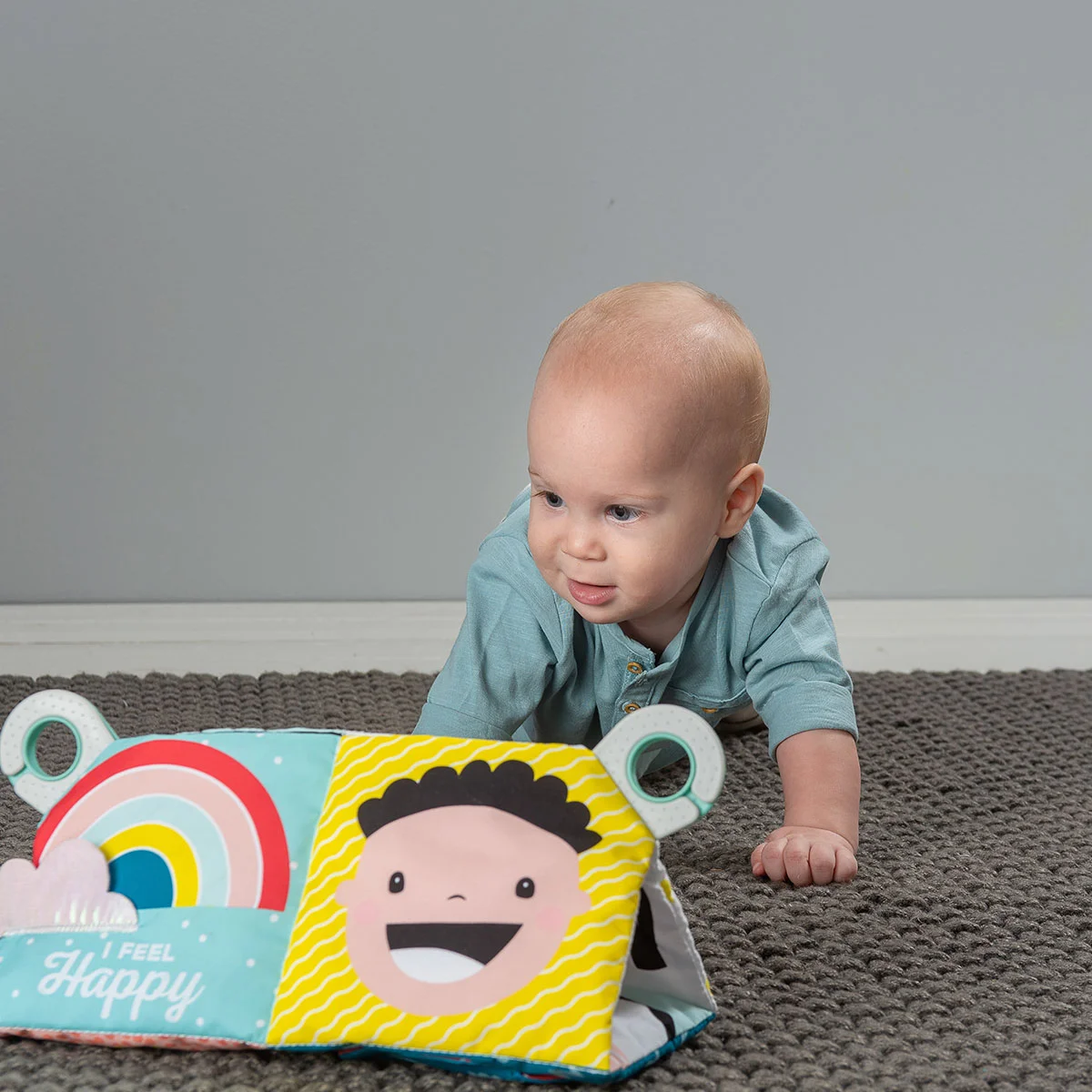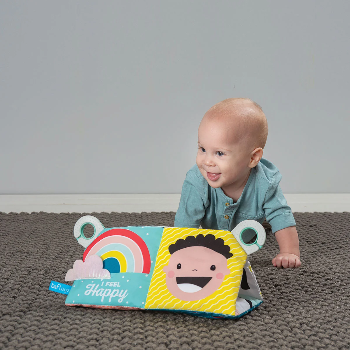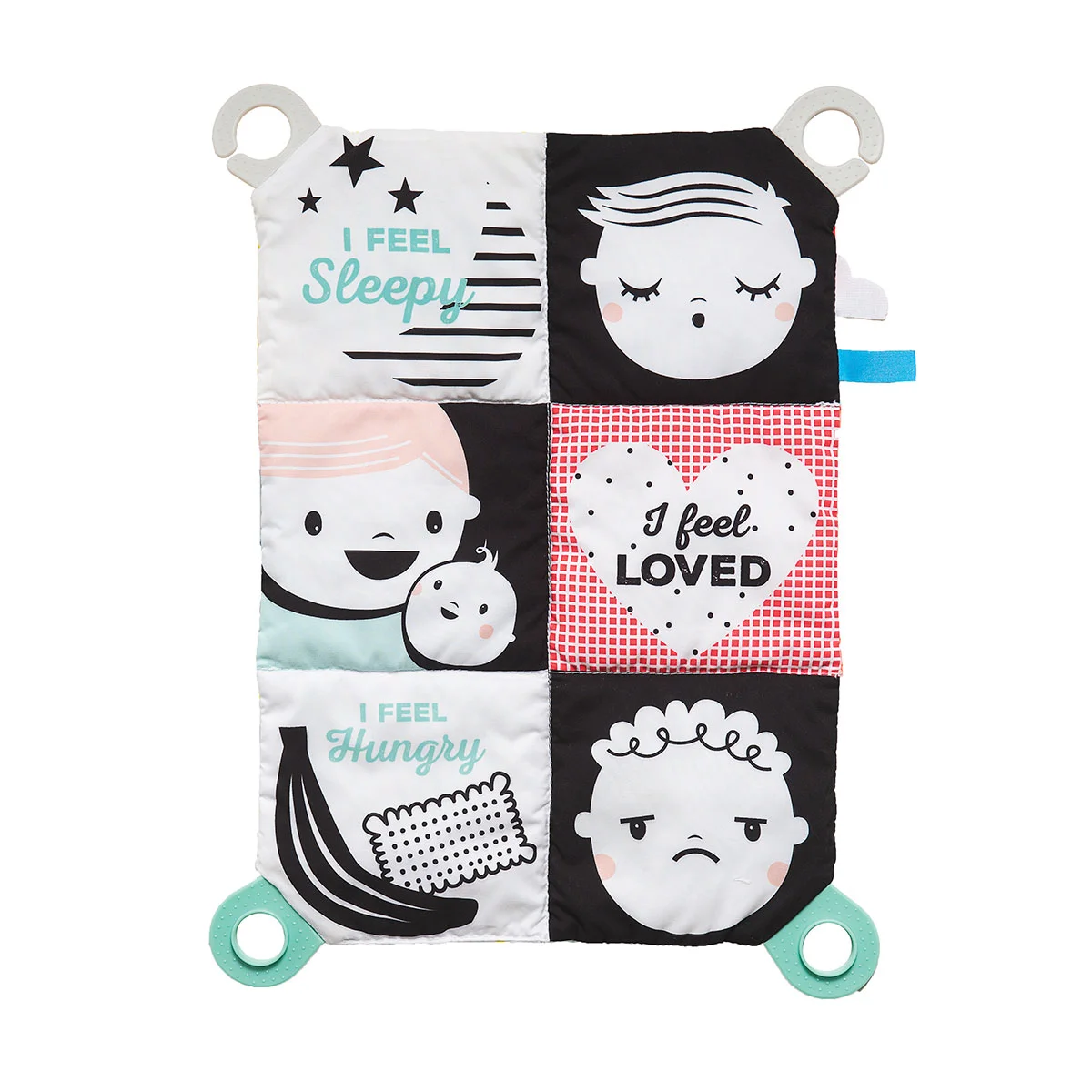 - Ця іграшка-книжечка знайомить дитину з п'ятьма основними емоційними станами: щасливим, сумним, сонним, голодним і здивованим.