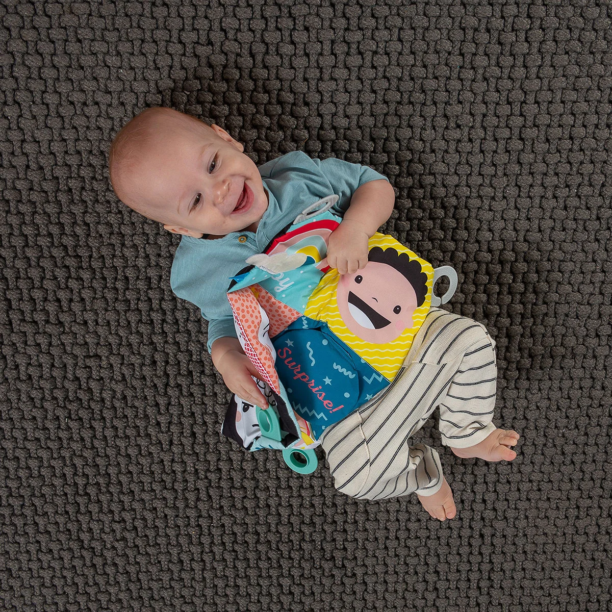 - Покладіть іграшку в розгорнутому вигляді поряд з дитиною, і їй цікаво буде чіпати її ручками або ніжками, досліджуючи звук, що шелестить, і розвиваючи велику моторику. У старшому віці малюкові буде цікаво чіпати дрібніші різноколірні елементи, розвиваючи сенсорику і дрібну моторику.