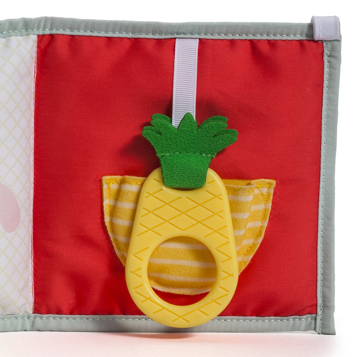 - На другій стороні - веселі барвисті картинки із вставками тканин різних текстур і розвиваючими елементами, деталями, які шарудять, та прорізувачем-ананасом.