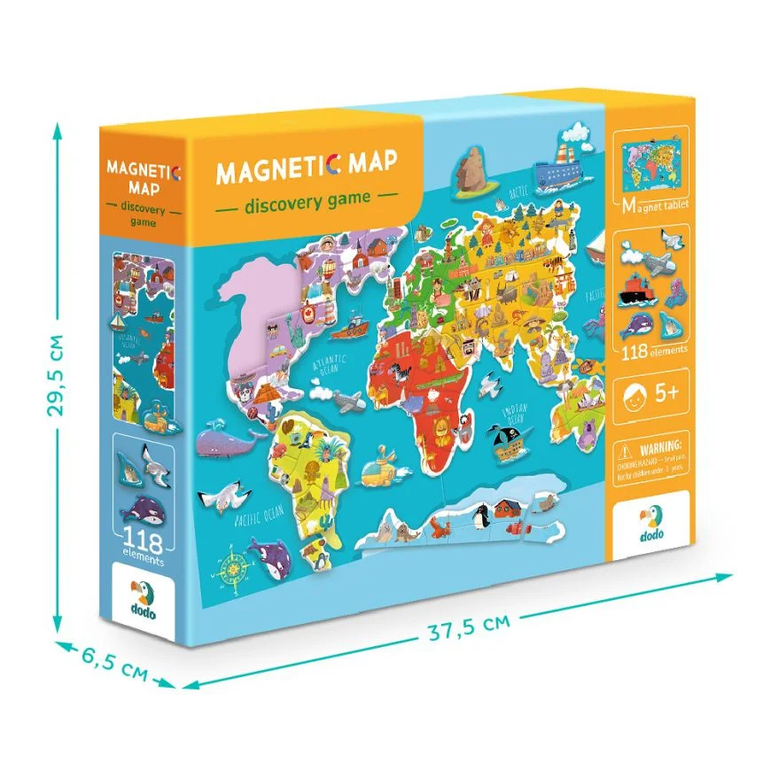 Час дізнатися більше про Землю! Вивчаємо континенти, тваринок, пам'ятки та ще багато цікавого з магнітною мапою. У наборі: магнітна планшетка з обрисом континентів та 118 елементів, які складаються у єдину картинку. Малюки можуть заповнювати мапу, дізнаватися нові слова чи вигадувати власні історії. Ось піратський корабель пливе до берегів Америки, а ось Австралія, оточена чудернацькими морськими мешканцями. А з чого почнемо твою пригоду?