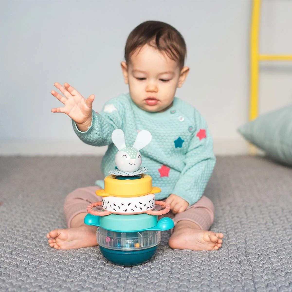 Малюк може не тільки весело грати з кроликом, але і розвивати логічне мислення, збираючи пірамідку.