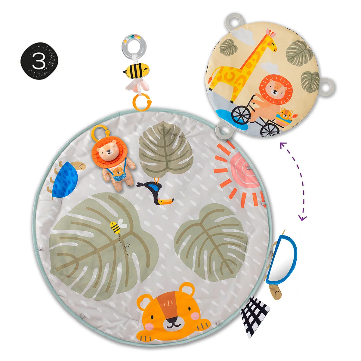 Має унікальну маленьку круглу ковдру, яка поєднується з елементами набору декількома способами: її можна розмістити вгорі на дугах, внизу на дугах або внизу на килимку. Це спонукає дитину практикувати різноманітні положення тіла та взаємодіяти з іграшками.