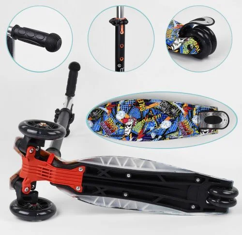 Самокат чотириколісний "Best Scooter". Передні - 12 см, задні здвоєні - 7,5 см, все зі світлом. Рама і кермо - алюміній; дека - пластик; колеса - поліуретан. Висота керма - від 62 до 84 см. Максимальне навантаження - 60 кг. Задній ножні гальма.