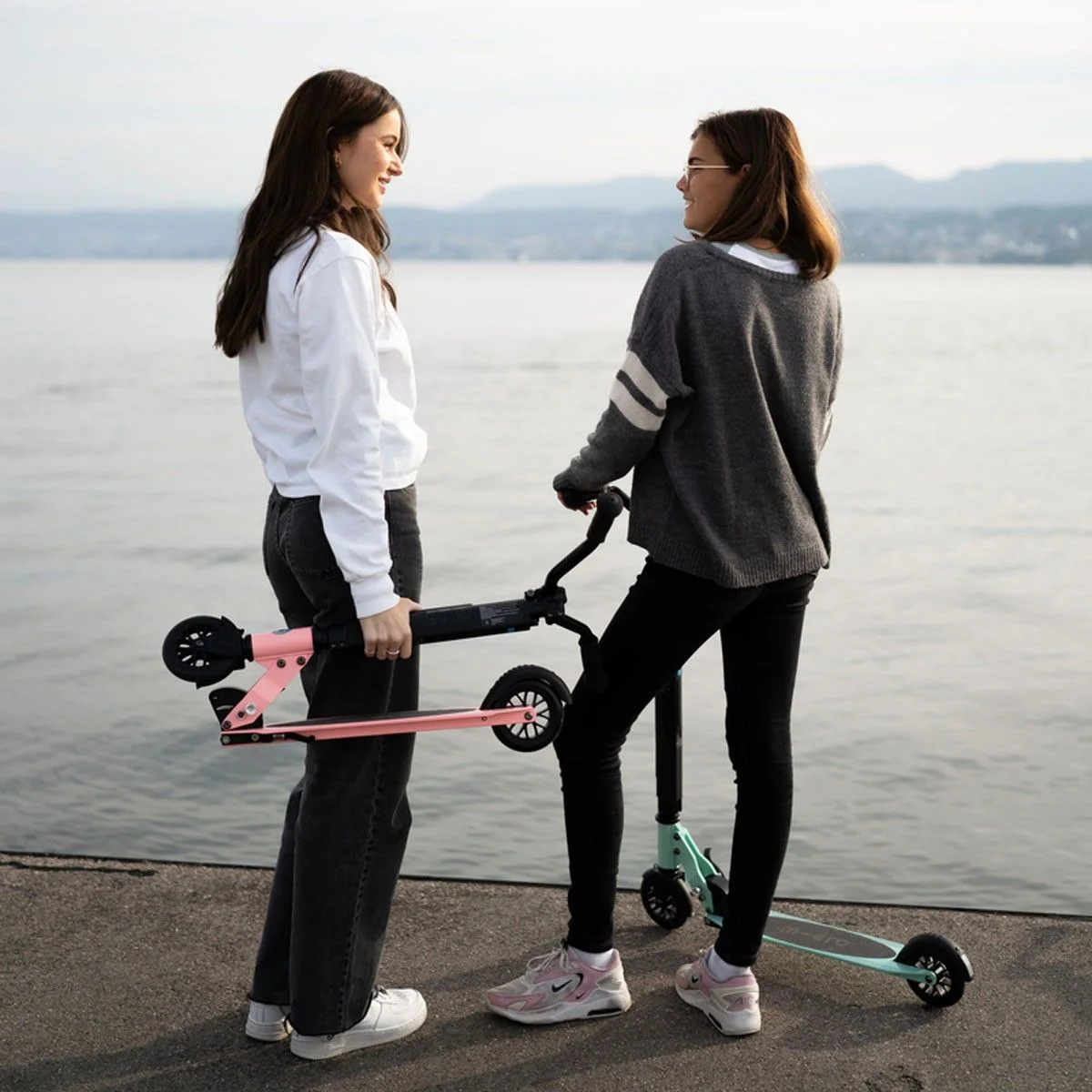 Дитячий самокат MICRO серії "Sprite Deluxe" – НЕОНОВИЙ РОЖЕВИЙ досконалий та міцний двоколісний самокат. Він оснащений світлодіодною вставкою на стійці.