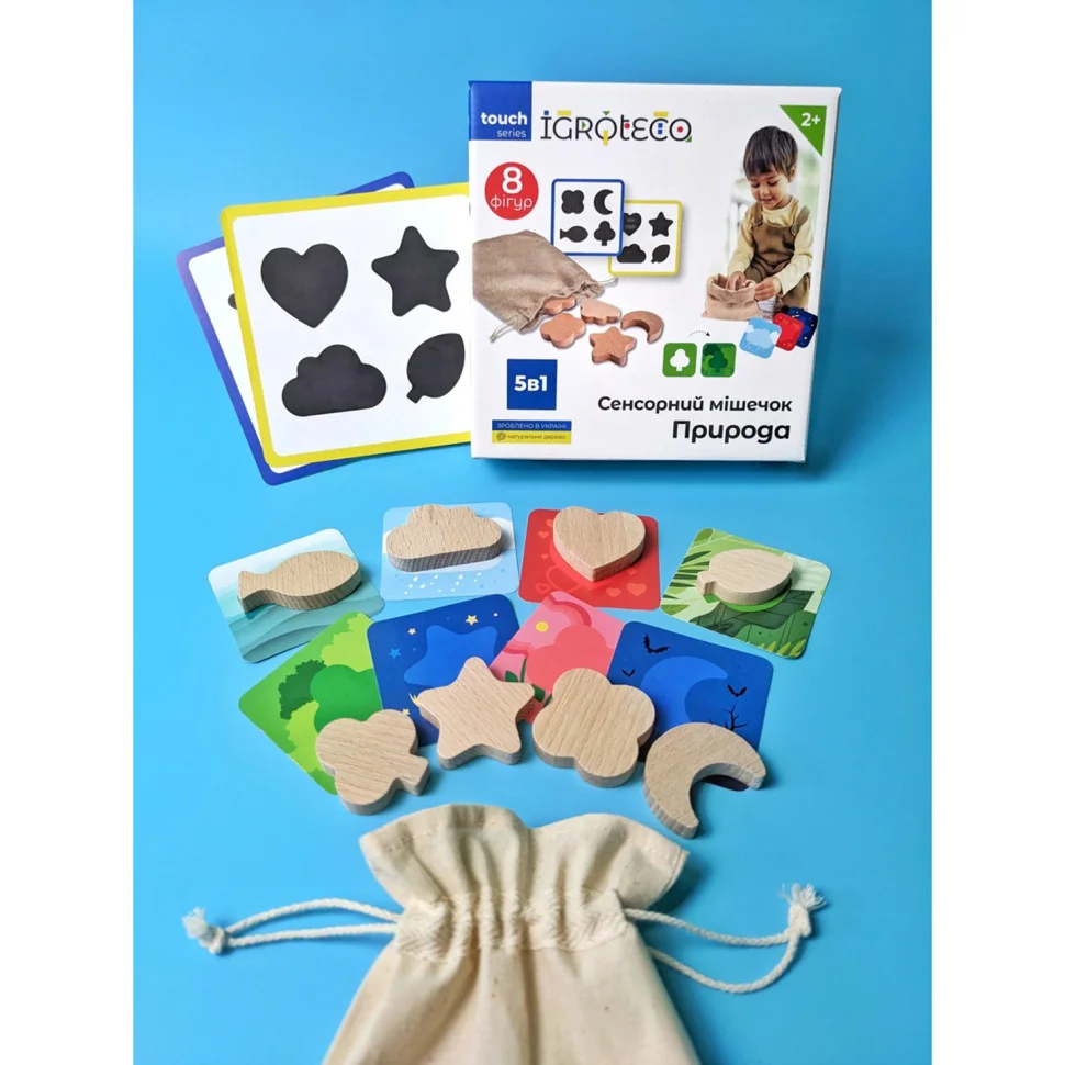 Сенсорний мішечок "Природа" - це чудова гра для сенсорних виражень. Дитина, перебираючи різні дерев'яні фігурки, розвиває тактильну чутливість і дрібну моторику, а отже і мовлення.