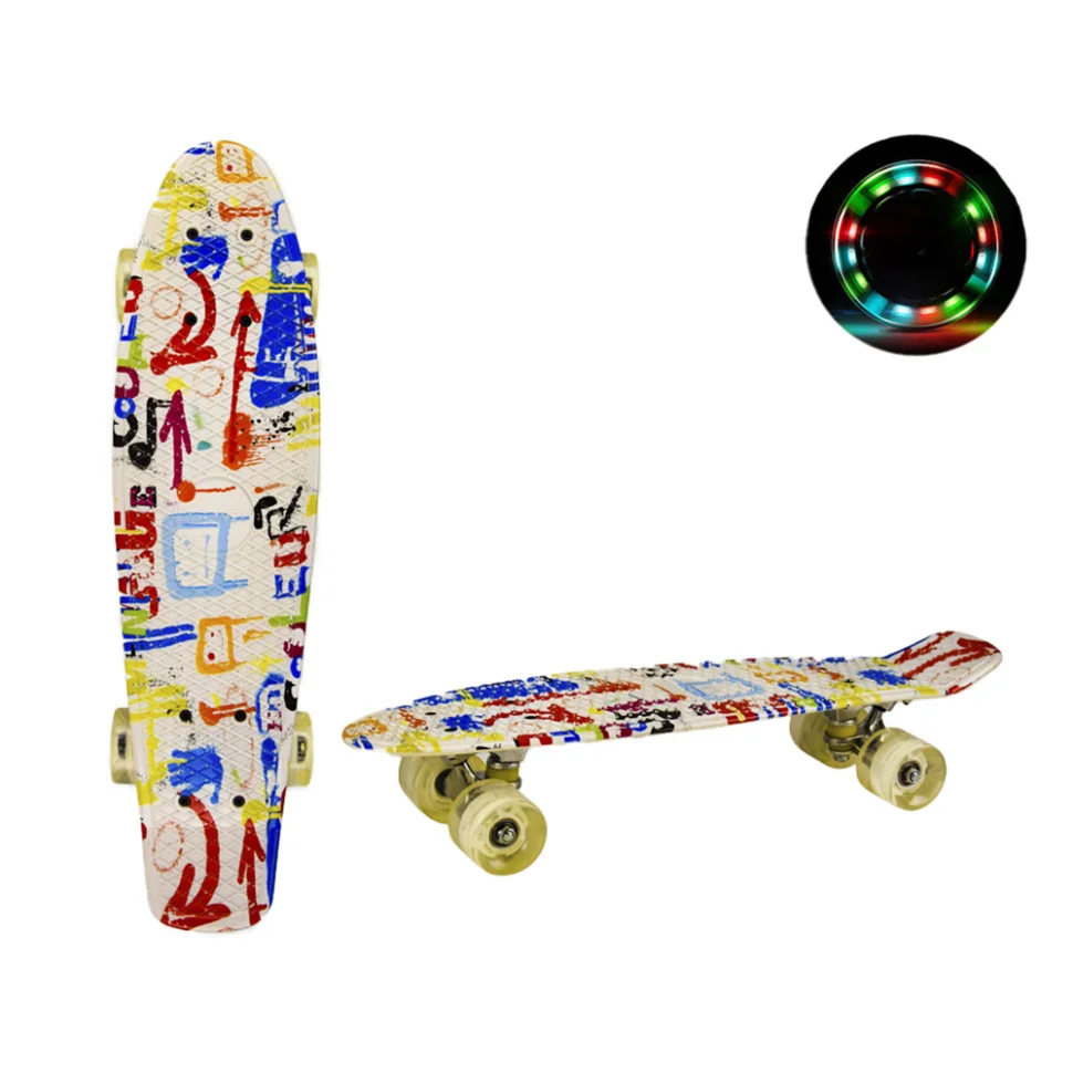 Пенні борд з колесами, що світяться - це легкий і компактний скейтборд, який відрізняється яскравим та веселим дизайном. Цей скейтборд має невеликий розмір та вагу, що робить його ідеальним для коротких поїздок по місту або круїзів на березі моря.